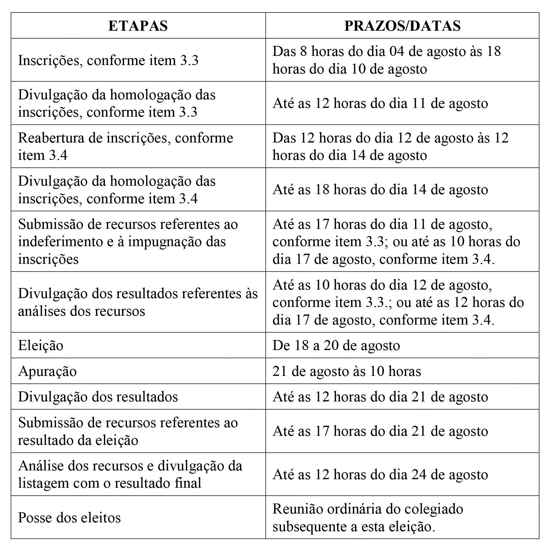 As inscrições serão realizadas a partir das 08h do dia 04 de agosto até às 18h do dia 10 de agosto. Na inexistência de inscrições para as vagas, será reaberto novo prazo de inscrição a partir das 12h do dia 12 de agosto até às 12h do dia 14 de agosto.