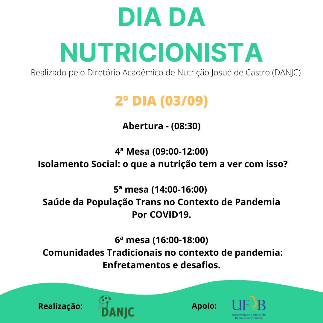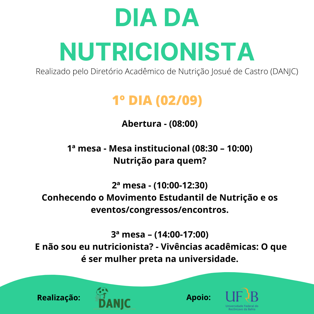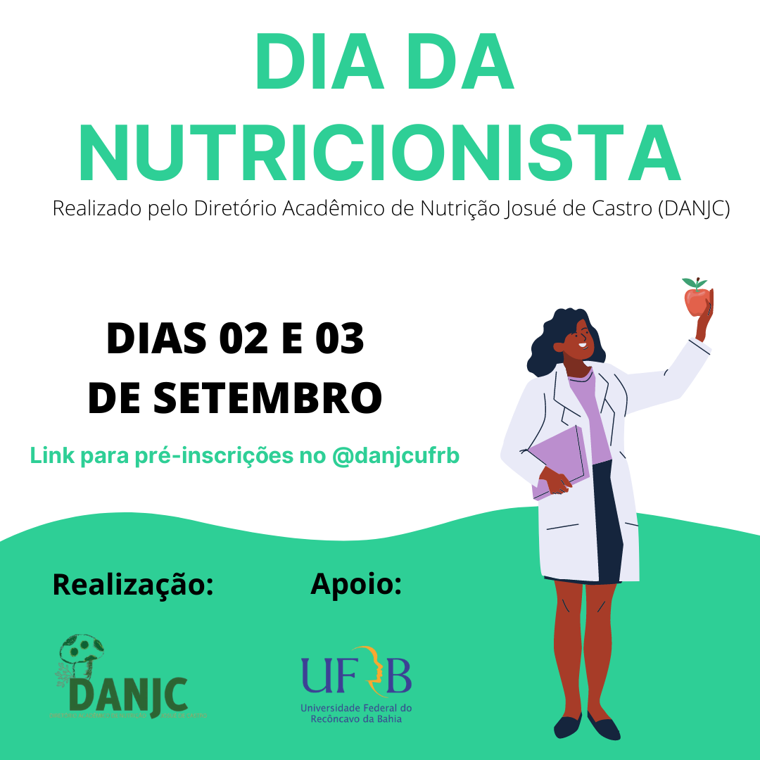 Em comemoração ao Dia da (o) Nutricionista, que acontece no dia 31 de agosto, o Diretório Acadêmico de Nutrição Josué de Castro – DANJC, preparou um evento para discutir assuntos de interesse dos estudantes de nutrição tais como: movimento estudantil na nutrição da UFRB e outros estados; eventos/congressos/encontros que acontecem na Bahia e fora do estado; proporcionar o debate sobre alimentação em tempos de pandemia; mostrar o atual contexto dos povos tradicionais trazendo falas de estudantes indígenas e quilombolas; entre outras mesas.