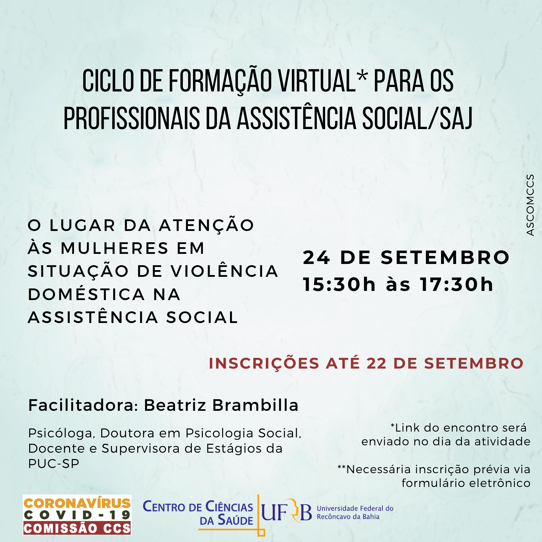 Até o dia 22 de setembro, estão abertas as inscrições para a 5ª edição do “Ciclo de Formação Virtual para os Profissionais da Assistência Social/SAJ”. O evento acontecerá no dia 24 de setembro, das 15:30 às 17:30. Pode se inscrever qualquer profissional que trabalhe no Sistema Único da Assistência Social (SUAS) em Santo Antônio de Jesus, tanto na proteção social básica, quanto na proteção social especial. O tema deste encontro será “O lugar da atenção às mulheres em situação de violência doméstica na Assistência Social” ministrado pela Psicóloga Beatriz Brambilla, doutora em Psicologia Social, Professora e Supervisora de Estágios na PUC-SP.