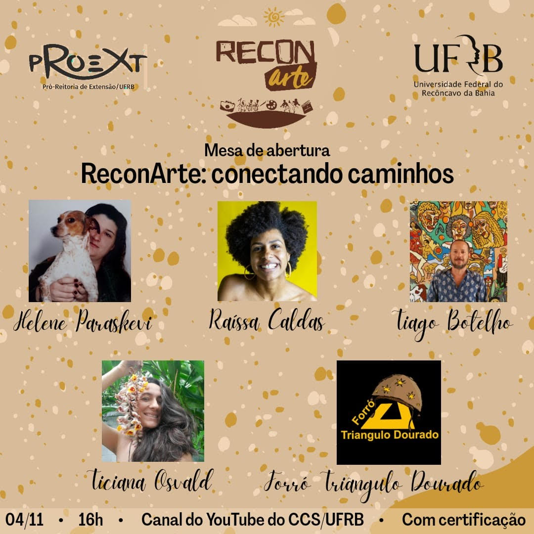 O ReconArte é um projeto de extensão UFRB que pretende aproximar os campus da Universidade e também os diferentes cantos do Recôncavo, por meio de oficinas e intervenções artísticas livres, que acontecerão de maneira remota através da plataforma Google Meet, afirmando a importância do coletivo nesse momento de pandemia. Acredita-se que possibilitar a criação de novas perspectivas e significados da academia, oferecendo um espaço acolhedor de criação, proposição e execução de saberes artísticos da comunidade, tornará os “tempos difíceis para os sonhadores” em que estamos vivendo algo mais leve, gerando um melhor desempenho nas atividades pedagógicas e principalmente na vinculação com o território do Recôncavo Baiano. Estimulando a aprendizagem e troca de saberes, unindo os eixos Ensino, Pesquisa e Extensão, contribuindo para inclusão de minorias, a partir de intervenções artísticas que acontecerão entre Novembro e Dezembro que podem ser submetidas por discentes, técnicos administrativos, professores e comunidade externa a UFRB de qualquer cidade do Recôncavo.