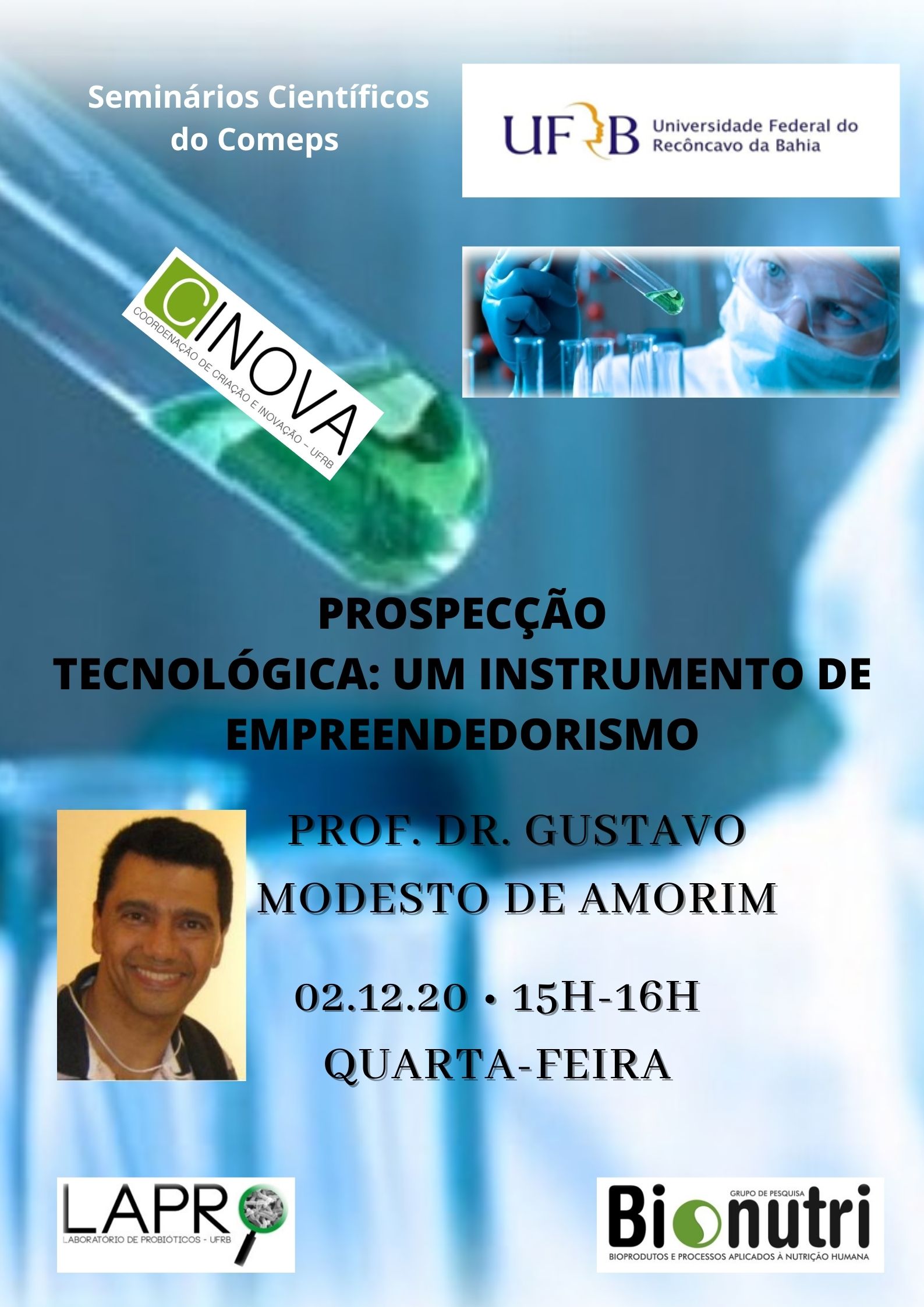Convidamos a todos e todas para o Seminário: "Prospecção Tecnológica: um Instrumento de Empreendedorismo" a ser apresentado pelo Professor Dr. Gustavo Modesto de Amorim no próximo dia 02 de dezembro, quarta-feira, das 15h às 16h. Pode ser inscrever qualquer pessoa interessada no tema. Esta apresentação faz parte do projeto de Extensão/Grupo de Estudos "Seminários Científicos do COMEPS" o qual tem os objetivos de aumentar a interação entre os grupos de pesquisa da UFRB visando a criação e consolidação de cursos de pós-graduação e a divulgação científica da produção do CCS no âmbito interno e externo à UFRB.