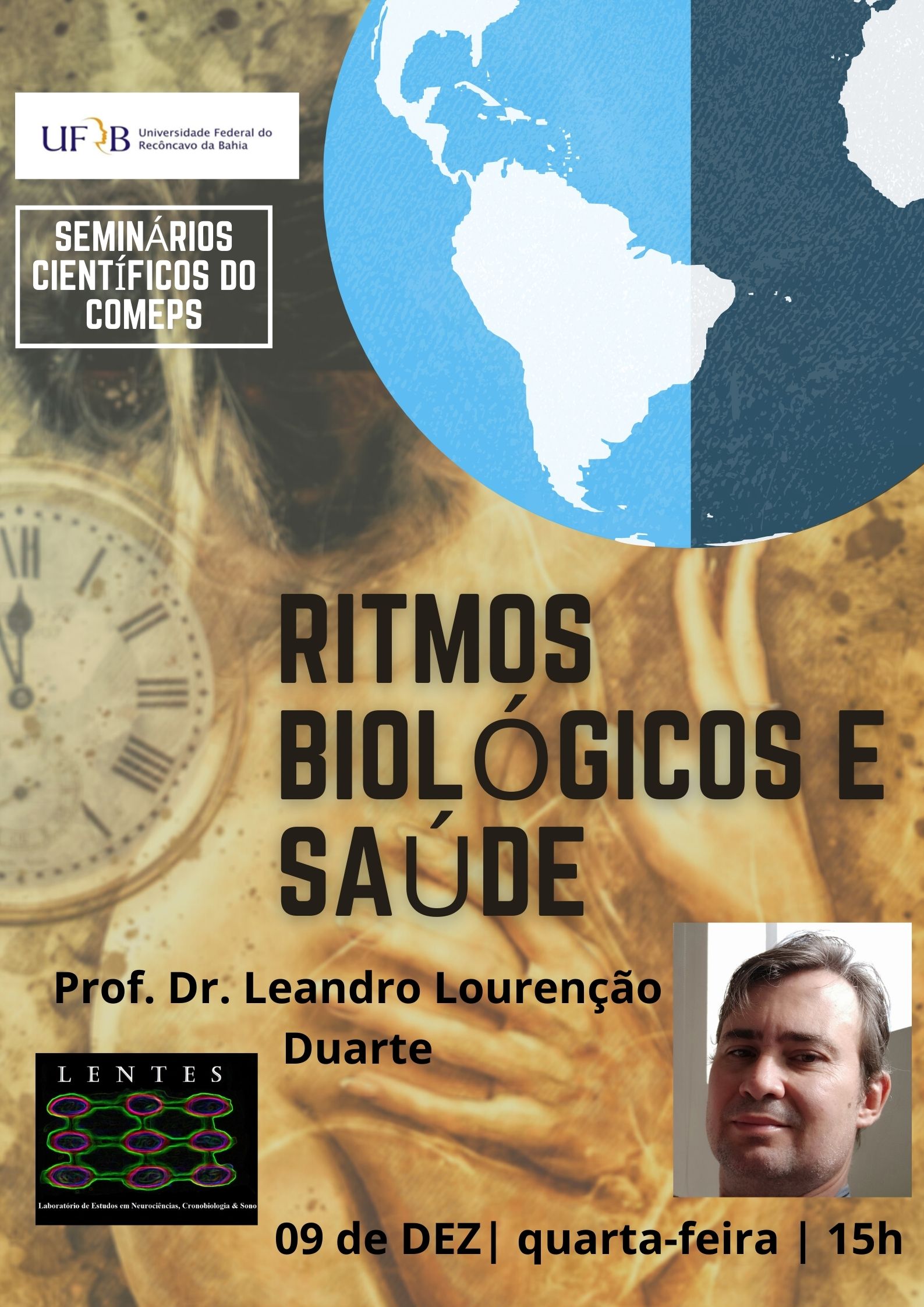 Convidamos a todos e todas para o Seminário "Ritmos Biológicos e Saúde" a ser apresentado pelo Professor Dr. Leandro Lourenção Duarte no próximo dia 09 de dezembro, quarta-feira, das 15h às 16h. Esta apresentação faz parte do projeto de Extensão/Grupo de Estudos "Seminários Científicos do COMEPS" o qual tem os objetivos de aumentar a interação entre os grupos de pesquisa da UFRB visando a criação e consolidação de cursos de pós-graduação e a divulgação científica da produção do CCS no âmbito interno e externo à UFRB.