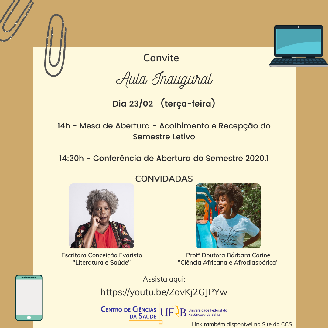 No dia 23 de fevereiro, às 14 horas, acontece via YouTube a aula inaugural do semestre 2020.1 com as participações da professora Drª Bárbara Carine* com o título "Ciência Africana e Afrodiaspórica" e da Escritora Conceição Evaristo**.