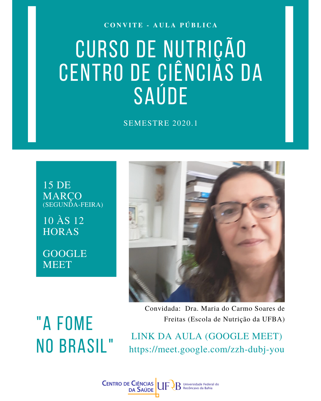 No dia 15 de março, às 10 horas, via Google Meet acontece a aula pública do curso de Nutrição do Centro de Ciências da Saúde - UFRB com a convidada Dra. Maria do Carmo Soares de Freitas (Escola de Nutrição da UFBA). O tema desta aula será "A fome no Brasil".