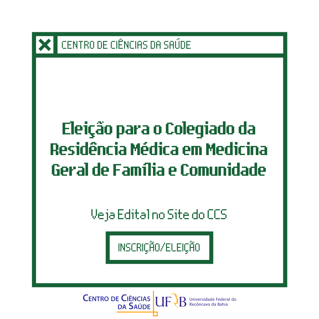 O Colegiado do Curso de Residência Médica em Medicina Geral de Família e Comunidade da Universidade Federal do Recôncavo da Bahia (UFRB) torna público o Edital de Eleição para preenchimento de 02 (duas) vagas para membro efetivo deste Colegiado.