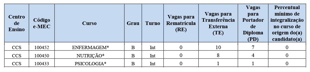 Para o Centro de Ciências das Saúde - CCS, há vagas paras os cursos de Enfermagem, Nutrição e Psicologia. (Ver anexo do I do Edital)
