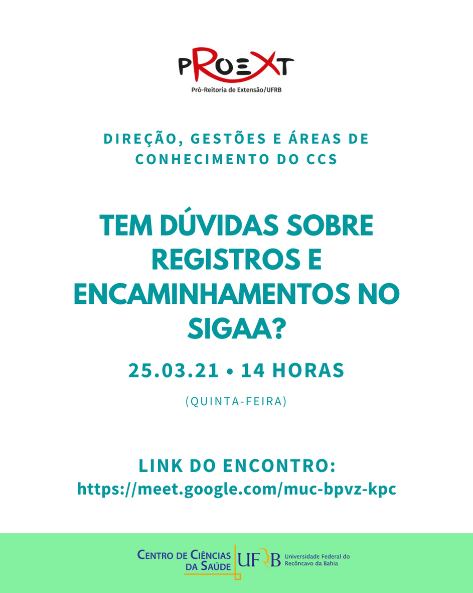 A PROEXT convida a direção, gestões e áreas de conhecimento do CCS para um encontro com o tema "Registros e Encaminhamentos no SIGAA". Acontece via Google Meet, dia 25 de março (quinta-feira), às 14 horas.