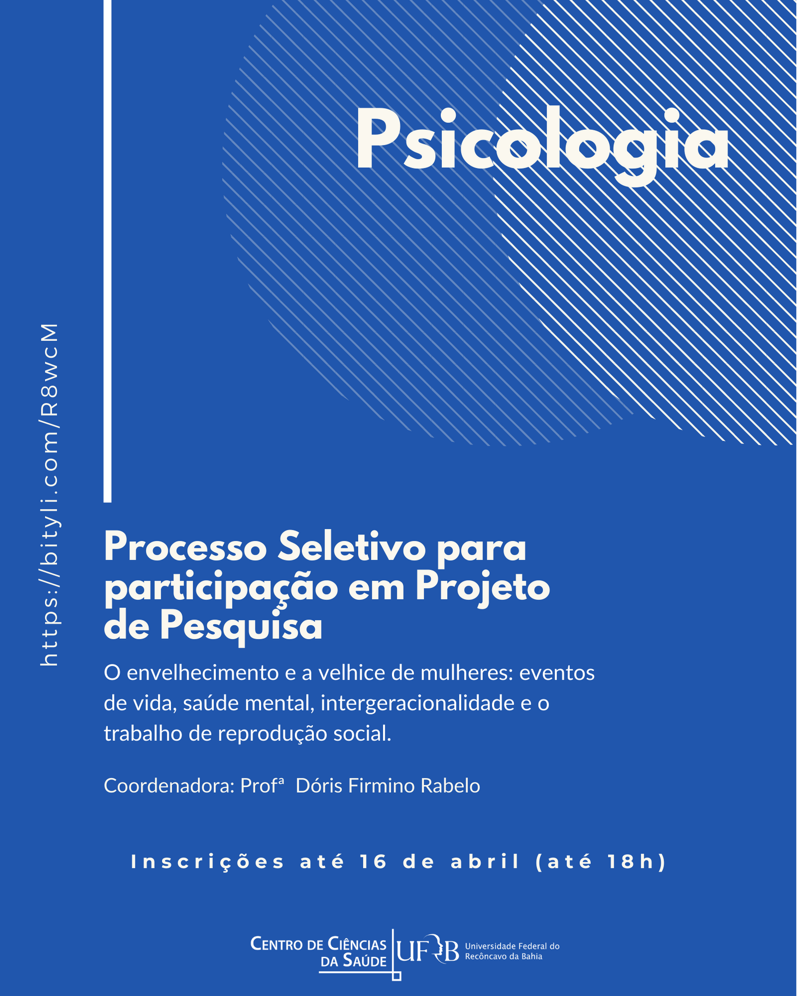 Até dia 16/04, às 18h, está aberto o processo seletivo para participação em projeto de pesquisa voltado para estudantes BIS-Psicologia (Bis com terminalidade em psicologia) e Psicologia. O objetivo da pesquisa é avaliar em mulheres na meia idade e idosas o uso do tempo em atividades de reprodução social, os eventos de vida estressantes, a saúde mental, os relacionamentos intergeracionais e compreender nas trajetórias de vida das mulheres os fatores de risco e proteção para o seu envelhecimento.