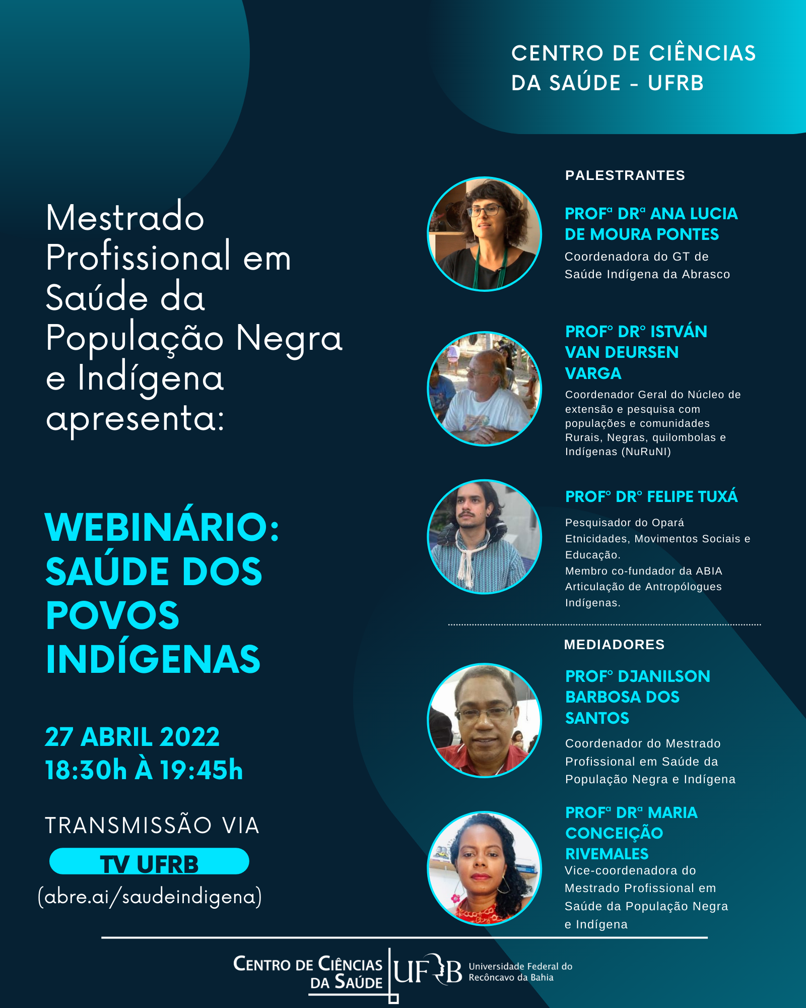Os palestrantes são a professora doutora Ana Lucia de Moura Pontes, coordenadora do GT de Saúde Indígena da Abrasco; professor doutor István Van Deursen Varga, coordenador geral do Núcleo de extensão e pesquisa com populações e comunidades Rurais, Negras, quilombolas e Indígenas (NuRuNI); professor doutor Felipe Tuxá, pesquisador do Opará Etnicidades, Movimentos Sociais e Educação e membro co-fundador da ABIA Articulação de Antropólogues Indígenas.