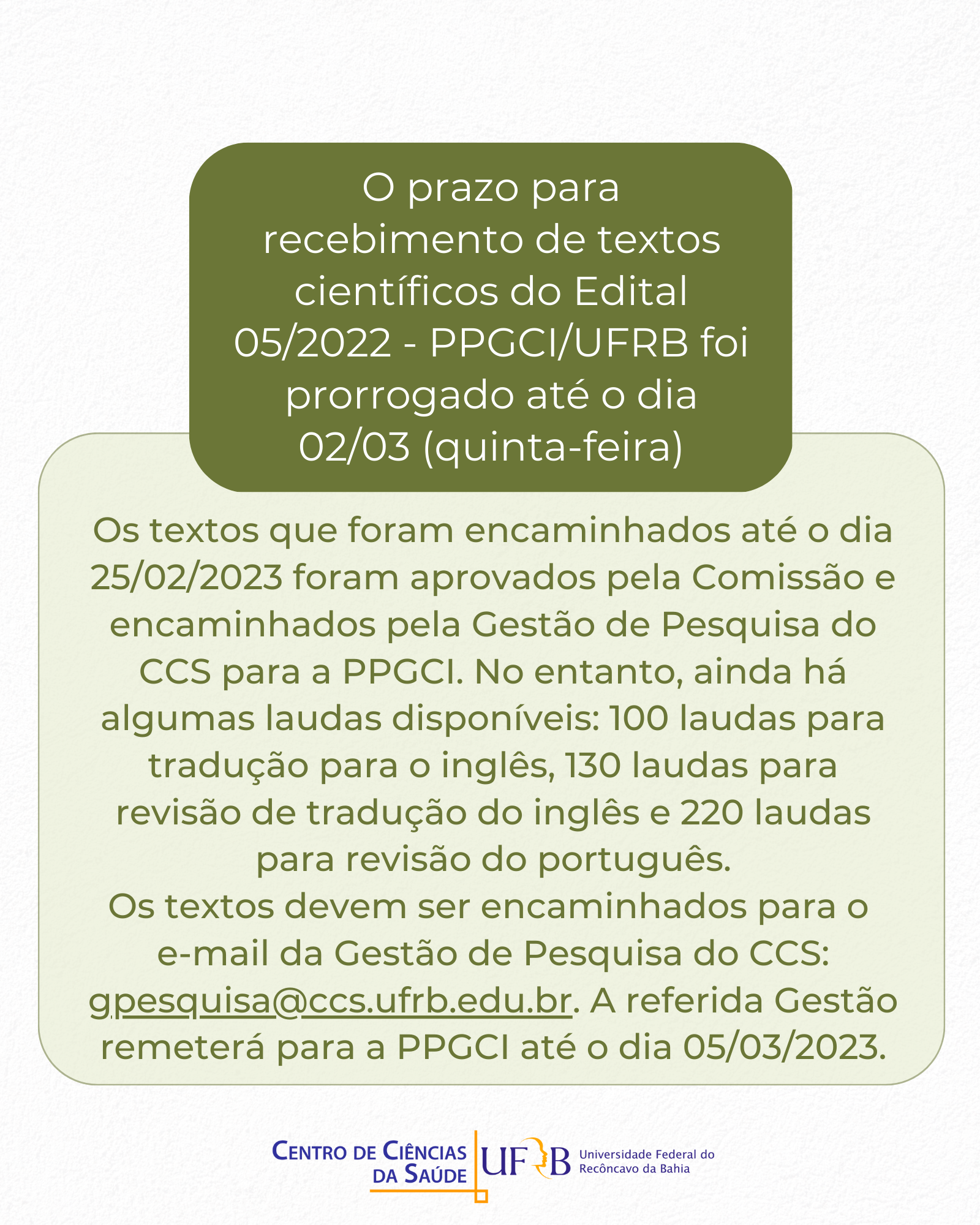 O prazo para recebimento de textos científicos do Edital 05/2022 - PPGCI/UFRB foi prorrogado até o dia 02/03 (quinta-feira)