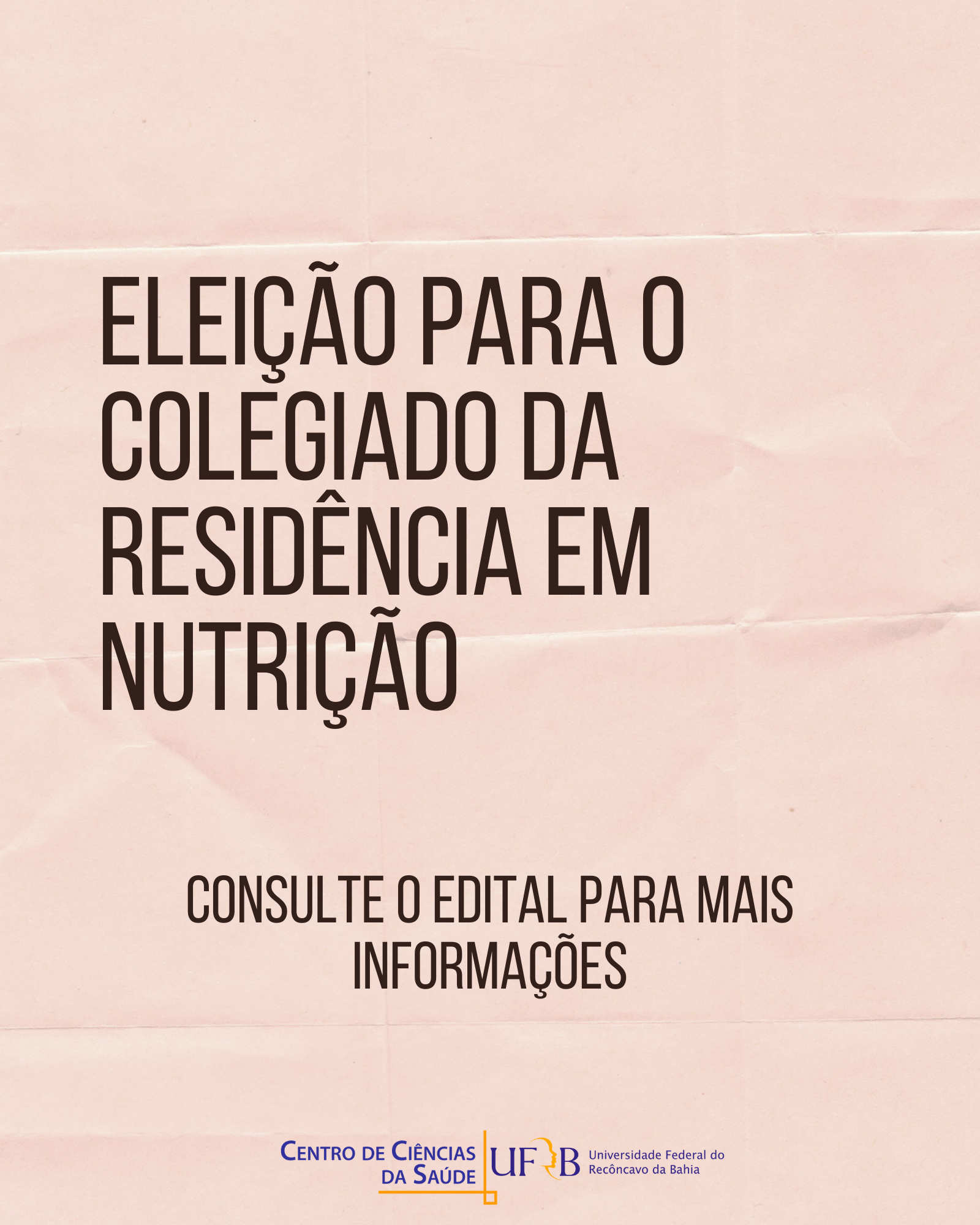 O Colegiado do Curso de Residência em Nutrição Clínica da Universidade Federal do Recôncavo da Bahia (UFRB), através da Comissão Eleitoral designada pela Ordem de Serviço nº 01, de 15 de Março de 2023, torna público o presente Edital de Eleição para preenchimento de 02 (duas) vagas para membro efetivo deste Colegiado.