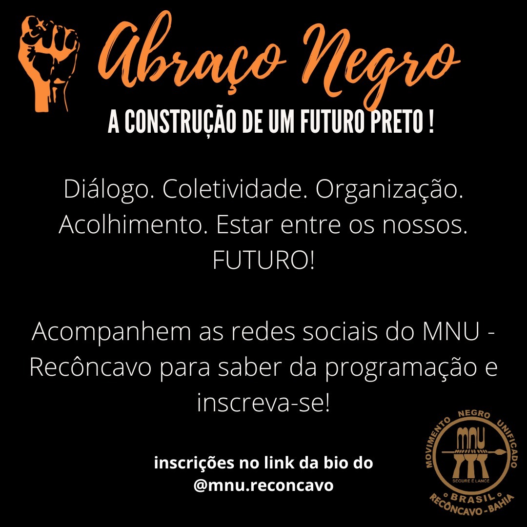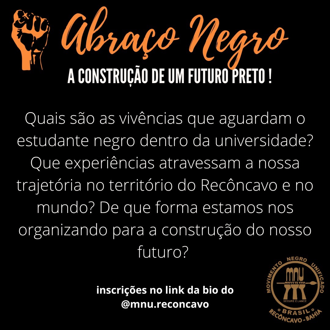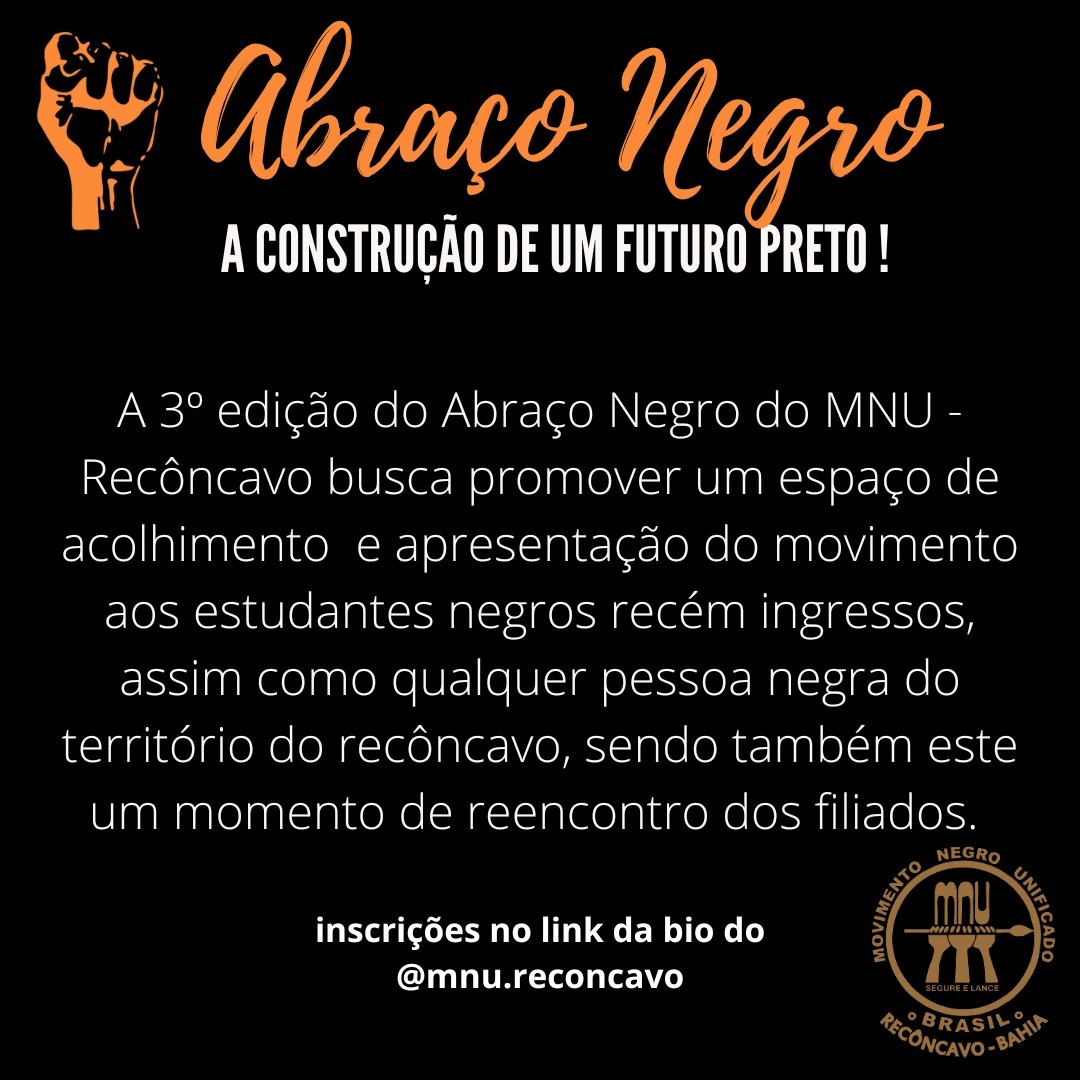 O Abraço Negro surge como um conjunto de atividades destinadas a apresentar os Movimentos Negros e, em especial, o Movimento Negro Unificado (MNU), a importância de um espaço seguro e auto-organizado pela própria comunidade negra, uma breve formação introdutória sobre algumas das questões históricas e contemporâneas que envolvem a temática racial em nosso país, debates específicos da realidade de cada centro de ensino da UFRB, e por fim, a apresentação de ações, desafios e projeções da luta negra nas cidades que compõem o território do Recôncavo da Bahia. O MNU Recôncavo, portanto, vem através do Abraço Negro, adensar, qualificar e convidar a comunidade negra acadêmica e do território, a se sentirem abraçados(as), mas também a construirem a luta racial dentro do território do Recôncavo da Bahia.