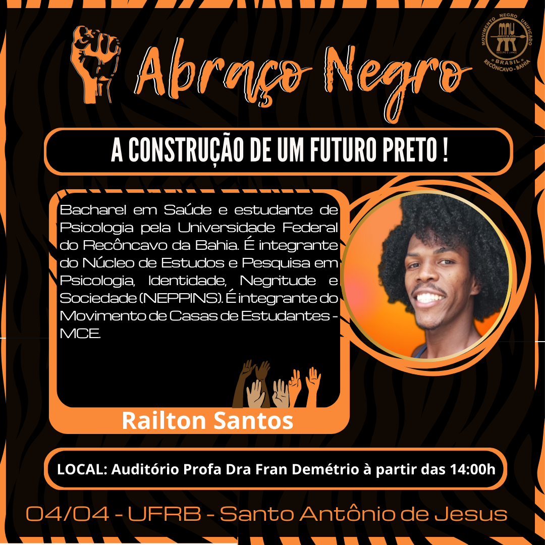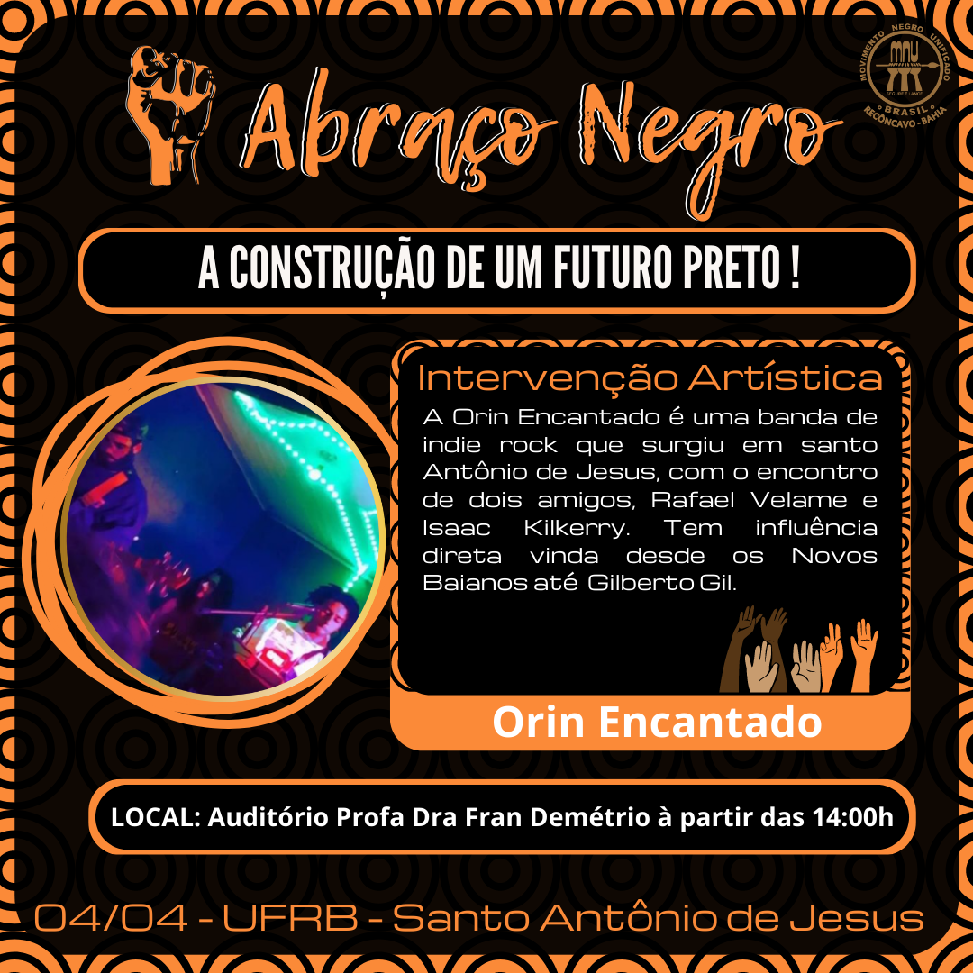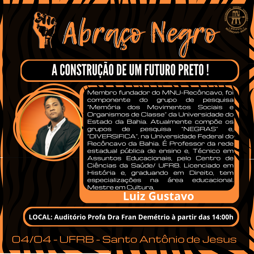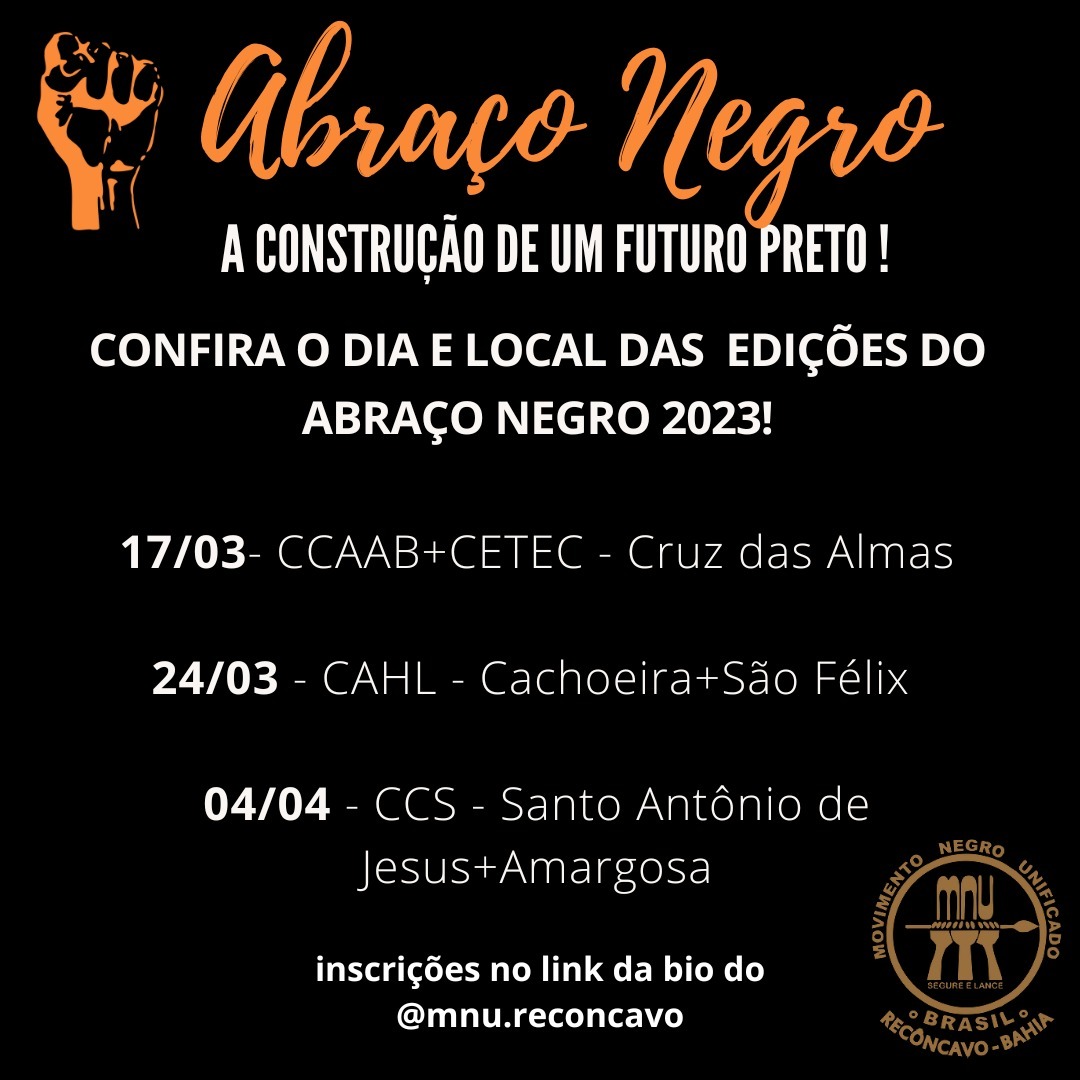O Abraço Negro surge como um conjunto de atividades destinadas a apresentar os Movimentos Negros e, em especial, o Movimento Negro Unificado (MNU), a importância de um espaço seguro e auto-organizado pela própria comunidade negra, uma breve formação introdutória sobre algumas das questões históricas e contemporâneas que envolvem a temática racial em nosso país, debates específicos da realidade de cada centro de ensino da UFRB, e por fim, a apresentação de ações, desafios e projeções da luta negra nas cidades que compõem o território do Recôncavo da Bahia. O MNU Recôncavo, portanto, vem através do Abraço Negro, adensar, qualificar e convidar a comunidade negra acadêmica e do território, a se sentirem abraçados(as), mas também a construirem a luta racial dentro do território do Recôncavo da Bahia.