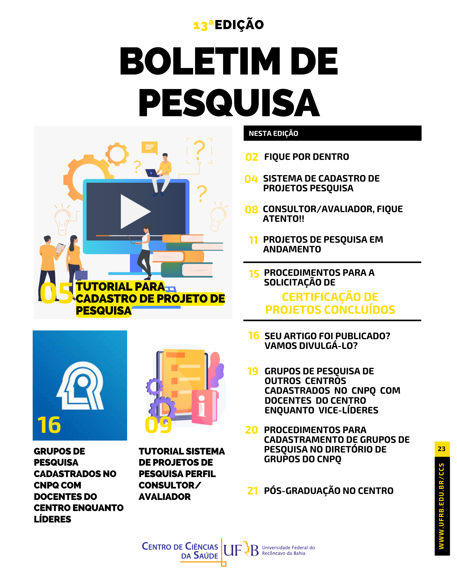 Considerando a necessidade de divulgação das atividades de pesquisa desenvolvidas no âmbito do Centro de Ciências da Saúde, a Gestão de Pesquisa torna público seu décimo terceiro Boletim de Pesquisa. Esse veículo de publicização das ações desenvolvidas no centro, de periodicidade semestral, estará disponível nos e-mails, Facebook e no nosso site (www.ufrb.edu.br/ccs).