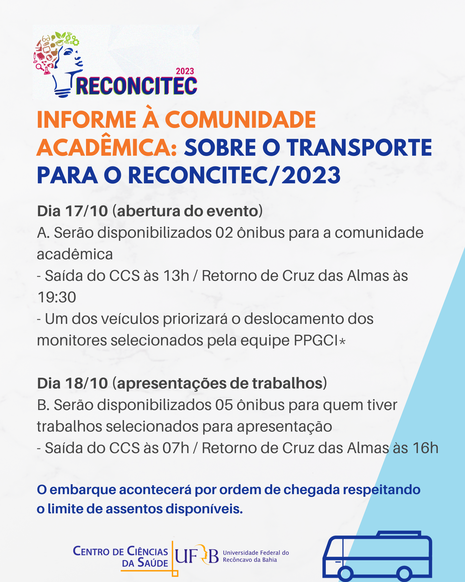 No período de 17 a 20/10/2023 teremos a realização do RECONCITEC, importante evento acadêmico e científico realizado na UFRB. A princípio queremos parabenizar a Comunidade Acadêmica do Centro de Ciências da Saúde pela expressiva participação neste evento, com a marca de 242 trabalhos aprovados. Considerando o compromisso institucional com a produção de uma Universidade de excelência no ensino, pesquisa e extensão e reconhecendo a necessidade de envidarmos esforços para viabilizar a presença da Comunidade no RECONCITEC, estivemos em diálogo com o setor central de transportes, em Cruz das Almas, de modo a garantir a quantidade de veículos em número e modelo compatível com o deslocamento de número tão expressivo de participantes. Hoje obtivemos a resposta favorável e a confirmação da Coordenadora de Serviços Operacionais/Proad de que teremos os ônibus disponíveis na medida das necessidades.