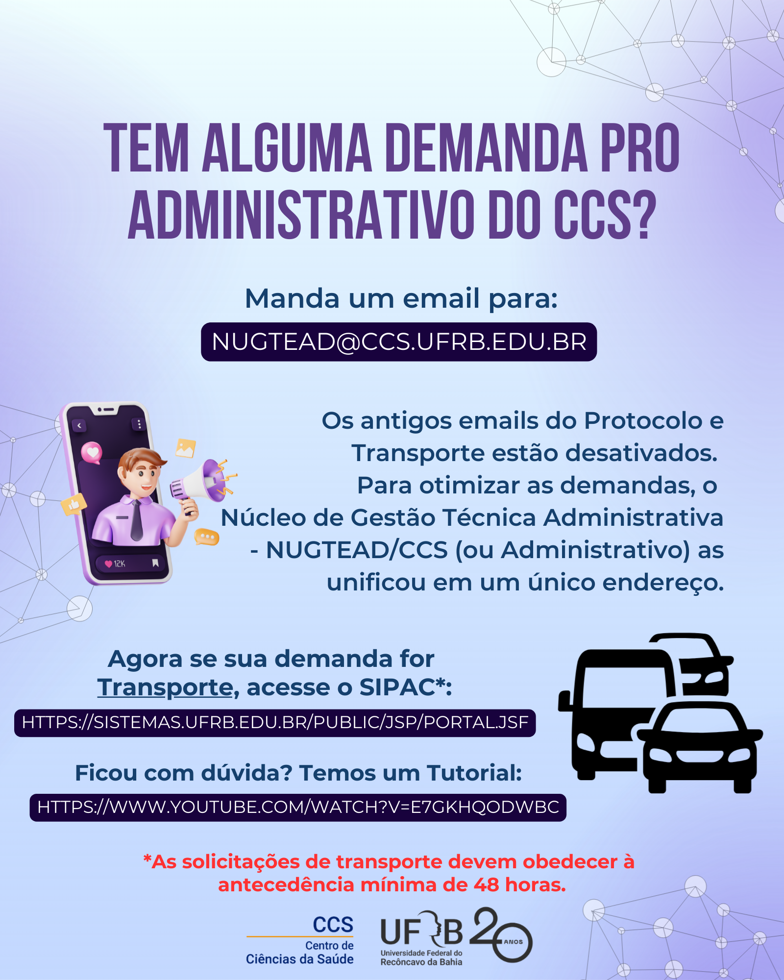 Agora se sua demanda for Transporte, acesse o SIPAC*: https://sistemas.ufrb.edu.br/public/jsp/portal.jsf