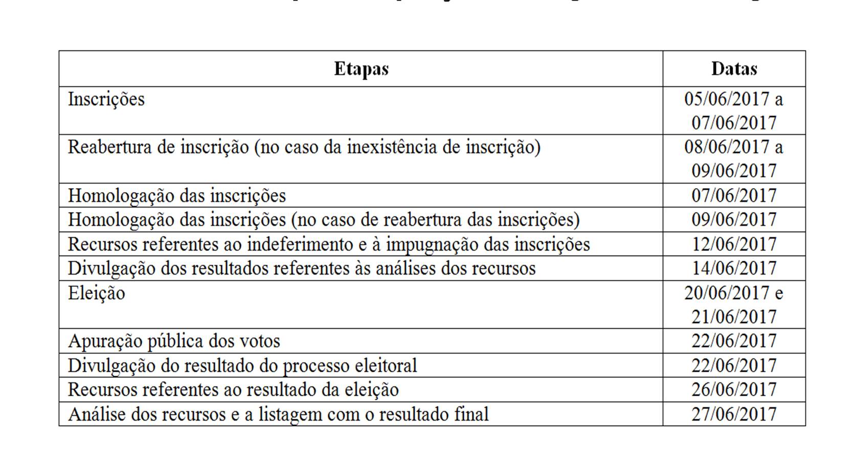 A eleição ocorrerá nos dias 20 e 21 de junho de 2017, das 8h às 12h e das 13h às 17h, na sala da Divisão de Apoio aos Colegiados DIACOL (antigo Núcleo de Apoio Acadêmico NUAPAC) sob responsabilidade do servidor técnico-administrativo Wilson Jesus de Oliveira Júnior.