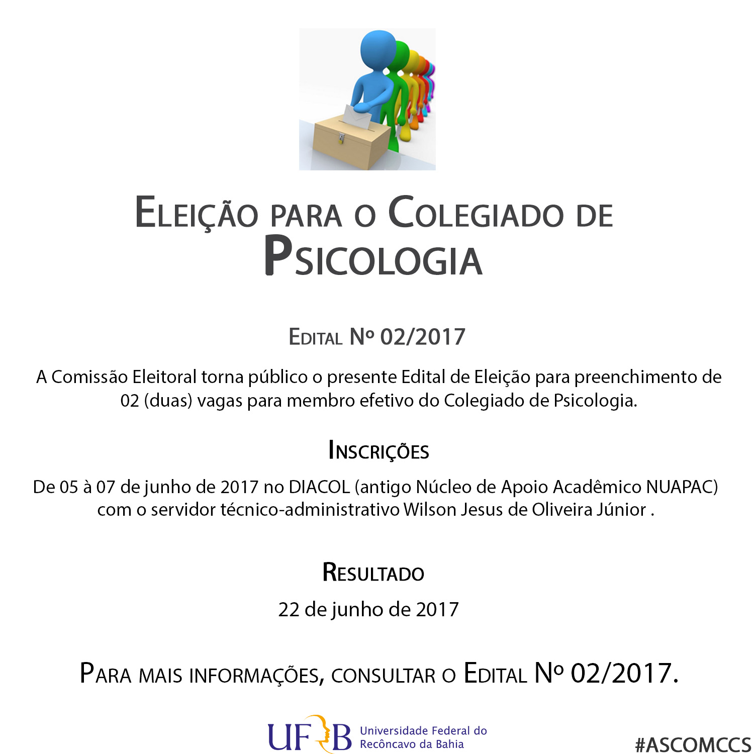 O Colegiado do Curso de Graduação em Psicologia da Universidade Federal do Recôncavo da Bahia (UFRB) torna público o presente Edital de Eleição para preenchimento de 02 (duas) vagas para membro efetivo deste Colegiado. O presente edital será amplamente divulgado por meio do mural de Psicologia, e do site do CCS <www.ufrb.edu.br/ccs>.