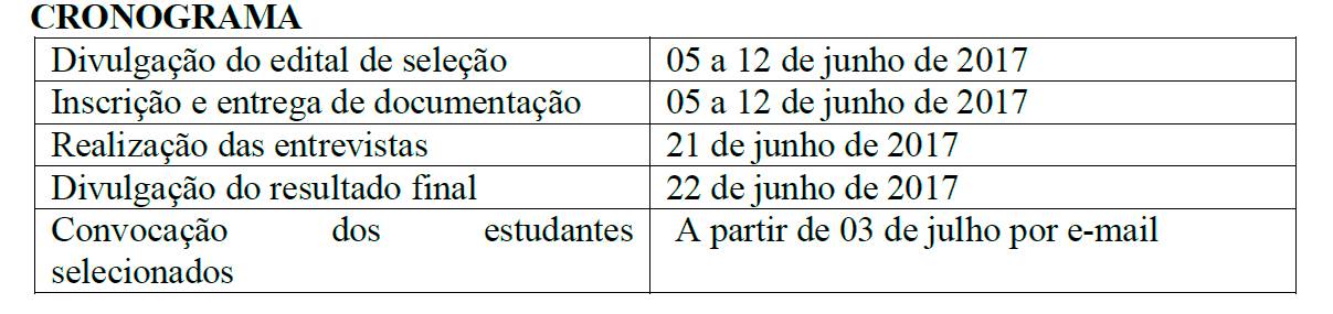 Poderão participar do presente processo de seleção os estudantes dos cursos de saúde da UFRB (BIS Enfermagem, BIS Medicina, BIS Nutrição, BIS Psicologia (a partir do 2 º. Semestre); Enfermagem, Medicina, Nutrição, Psicologia, BIS até 6º semestre). As inscrições serão realizadas por e-mail (Este endereço de email está sendo protegido de spambots. Você precisa do JavaScript ativado para vê-lo.) no período entre os dias 5 e 12 de junho de 2017 até 23:59h. Os estudantes deverão ter disponibilidade de 10 horas semanais, distribuídas em dois turnos (4 horas) ininterruptas de segunda a sexta manhã e/ou tarde (entre 8 às 17 horas). As 08 horas deverão ser dedicadas às atividades de coleta de dados e as 2 horas restantes serão destinadas às reuniões semanais com a coordenação da pesquisa.