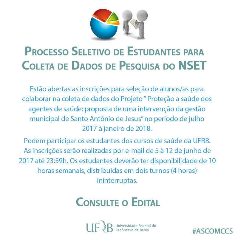 As Pesquisadoras Elaine Andrade Leal Silva, Margarete Costa Heliotério, Paloma de Sousa Pinho e Fernanda Queiroz Rego de Sousa Lopes do Núcleo Saúde Educação e Trabalho do CCS/UFRB informam aos discentes dos cursos de graduação deste centro de ensino que estão abertas as inscrições para seleção de alunos/as para colaborar na coleta de dados do Projeto Intitulado “ Proteção a saúde dos agentes de saúde: proposta de uma intervenção da gestão municipal de Santo Antônio de Jesus” que ocorrerá no período de julho 2017 a janeiro de 2018. Será ofertado o total de dez vagas para estudantes matriculados nos cursos da área de saúde.
