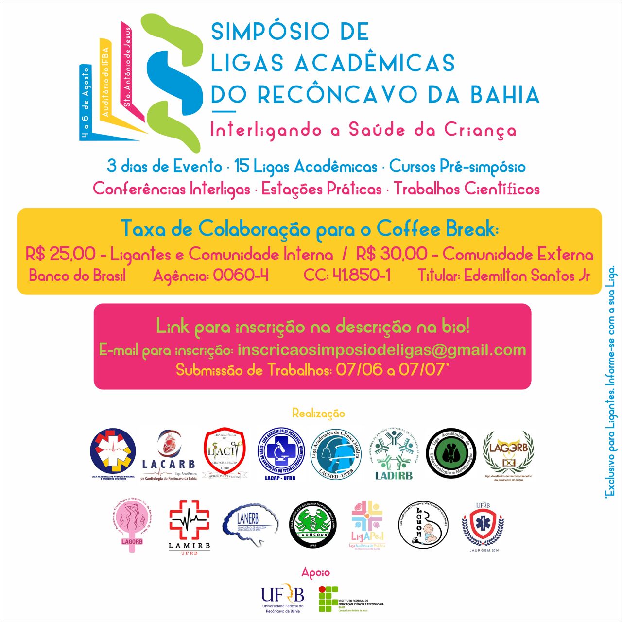 Simpósio de Ligas Acadêmicas do Recôncavo da Bahia: Interligando a Saúde da Criança - 4 a 6 de Agosto de 2017 no auditório do IFBA Campus Santo Antônio de Jesus.