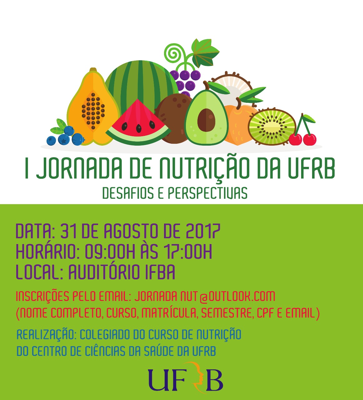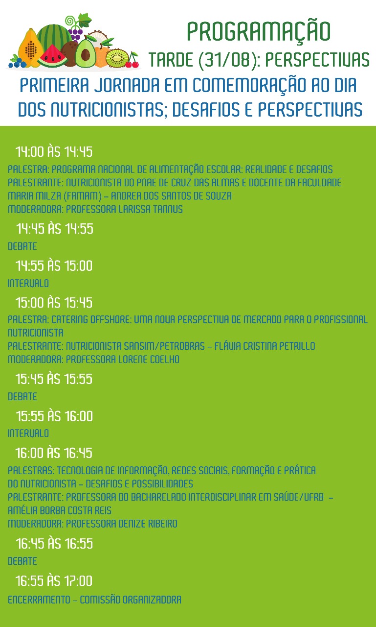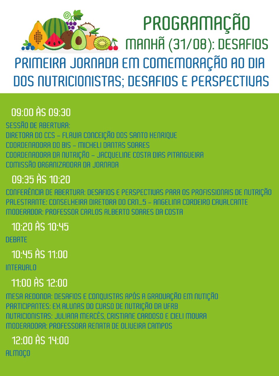 No próximo dia 31 de agosto, das 09h às 17h, acontecerá no Auditório do IFBA, em Santo Antônio de Jesus, a I Jornada de Nutrição da UFRB: Desafios e Perspectivas. O evento, organizado pelo Colegiado de Nutrição, conta com uma programação variada com mesas redondas e palestras sobre: Desafios e Perspectivas; realidade pós conclusão do curso de Nutrição; PNAE; Cattering Offshore e Tecnologias da Informação direcionadas à profissão do nutricionista.