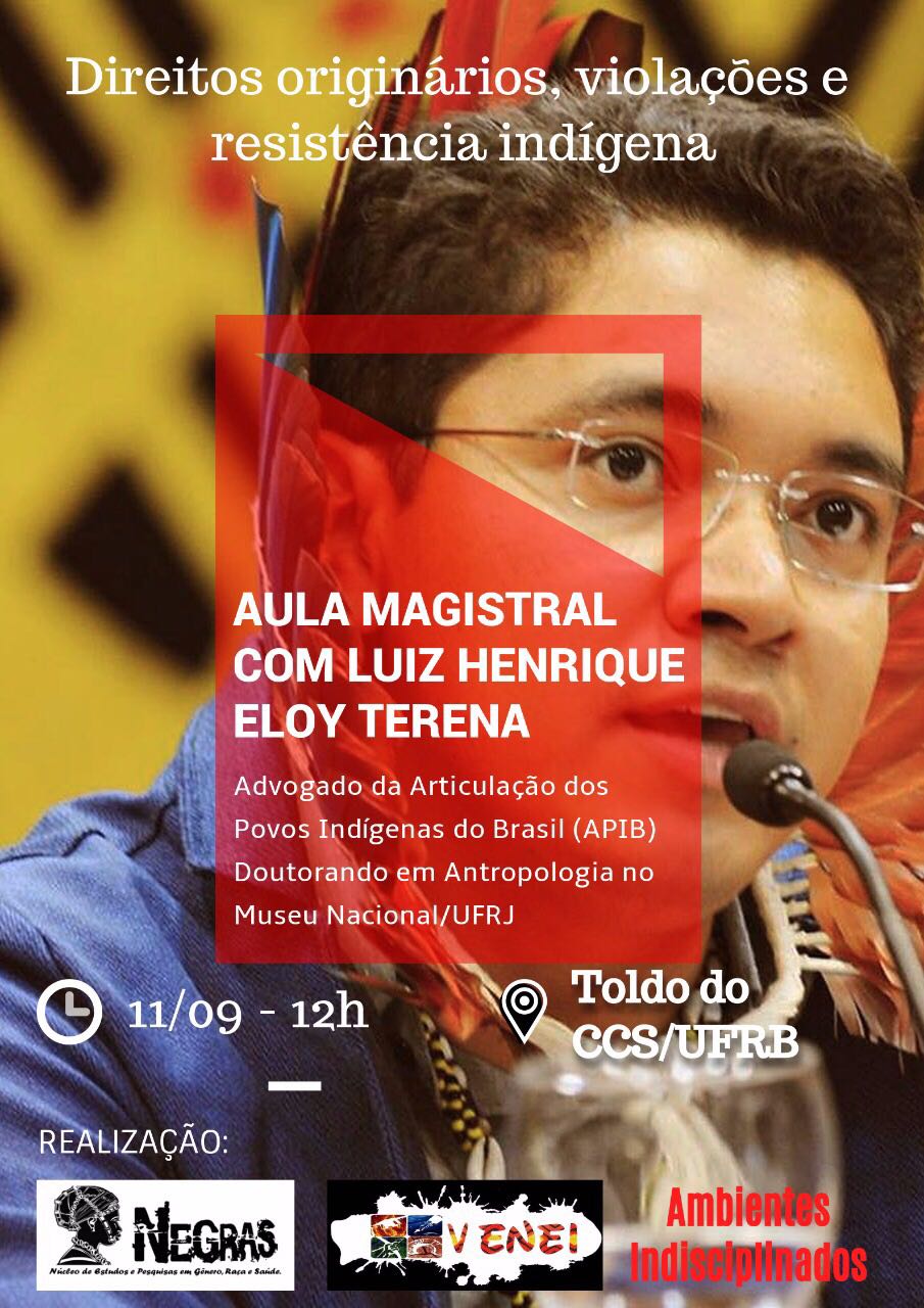 Direitos originários, violações e resistência indígena: Aula magistral com Luiz Henrique Eloy Terena, advogado da APIB e doutorando no Museu nacional, para o encerramento do semestre dos componentes "descolonização do conhecimento: universidade, sociedade e ambiente" e "meio ambiente, saúde e saneamento", no Centro de Ciências da Saúde da UFRB em Santo Antônio de Jesus, organizado pelo Grupo de Pesquisas em Gênero, Raça e Saúde (NEGRAS) e Ambientes Indisciplinados, com apoio do Encontro Nacional de Estudantes Indígenas (V ENEI).