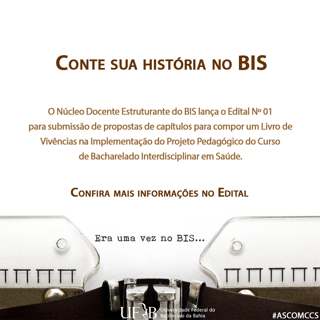 A Comissão Organizadora do Projeto de Livro de Vivências na Implementação do Projeto Político Pedagógico do BIS/CCS da Universidade Federal do Recôncavo da Bahia torna público o presente edital de abertura de Submissão de capítulos com relato de experiências no âmbito do curso para composição do livro referido.
