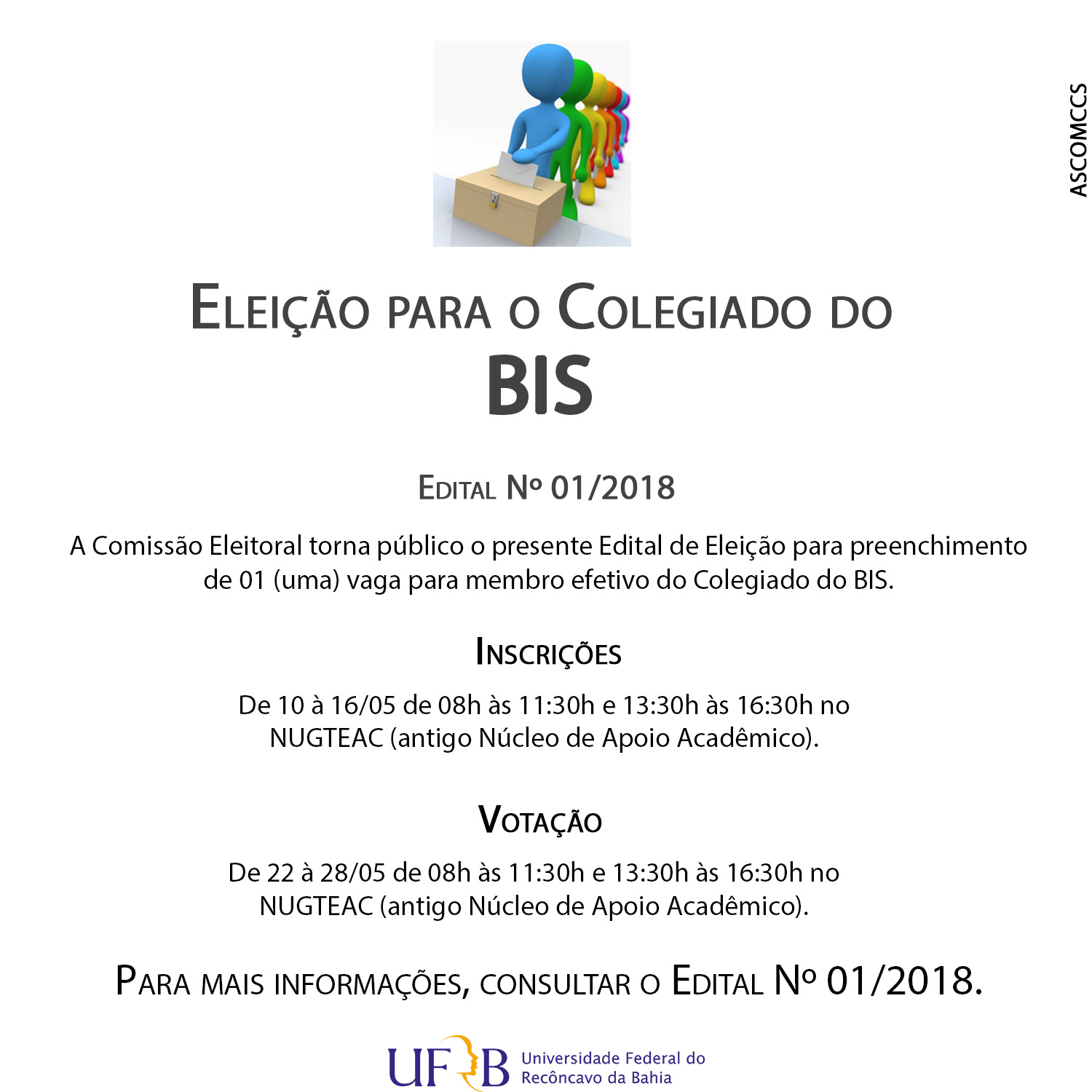 O Colegiado do Curso de Graduação do BIS da Universidade Federal do Recôncavo da Bahia (UFRB) torna público o presente Edital de Eleição para preenchimento de 01 (uma) vaga para membro efetivo deste Colegiado.