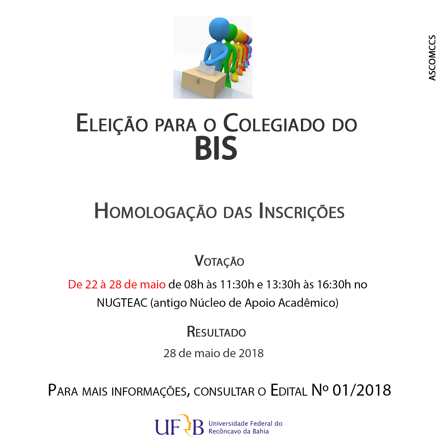Ocorrerá de 22 à 28 de maio de 2018, das 08h às 11:30h e 13:30h às 16:30h, no NUGTEAC (antigo Núcleo de Apoio Acadêmico). Estão aptos a votar todos(as) os(as) docentes que ministram aulas no Curso do BIS. O voto é livre e secreto. Cada docente/eleitor(a) votará para um docente de acordo com a vaga referente à área de conhecimento, em conformidade com a instrução na cédula eleitoral. Quando houver mais candidatos do que vagas, o candidato com maior número de votos será eleito. No caso de empate será considerado eleito o candidato que atender aos seguintes critérios classificatórios: Maior titulação; Maior tempo na instituição; Pessoa com maior idade. No ato da votação, os eleitores deverão apresentar algum documento de identidade com foto.