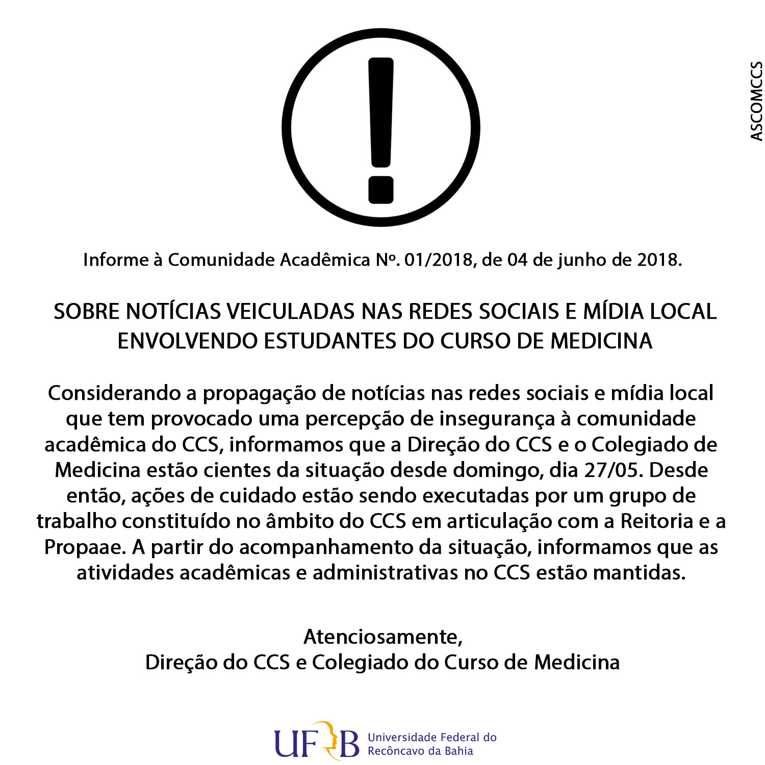 Considerando a propagação de notícias nas redes sociais e mídia local que tem provocado uma percepção de insegurança à comunidade acadêmica do CCS, informamos que a Direção do CCS e o Colegiado de Medicina estão cientes da situação desde domingo, dia 27/05. Desde então, ações de cuidado estão sendo executadas por um grupo de trabalho constituído no âmbito do CCS em articulação com a Reitoria e a Propaae.