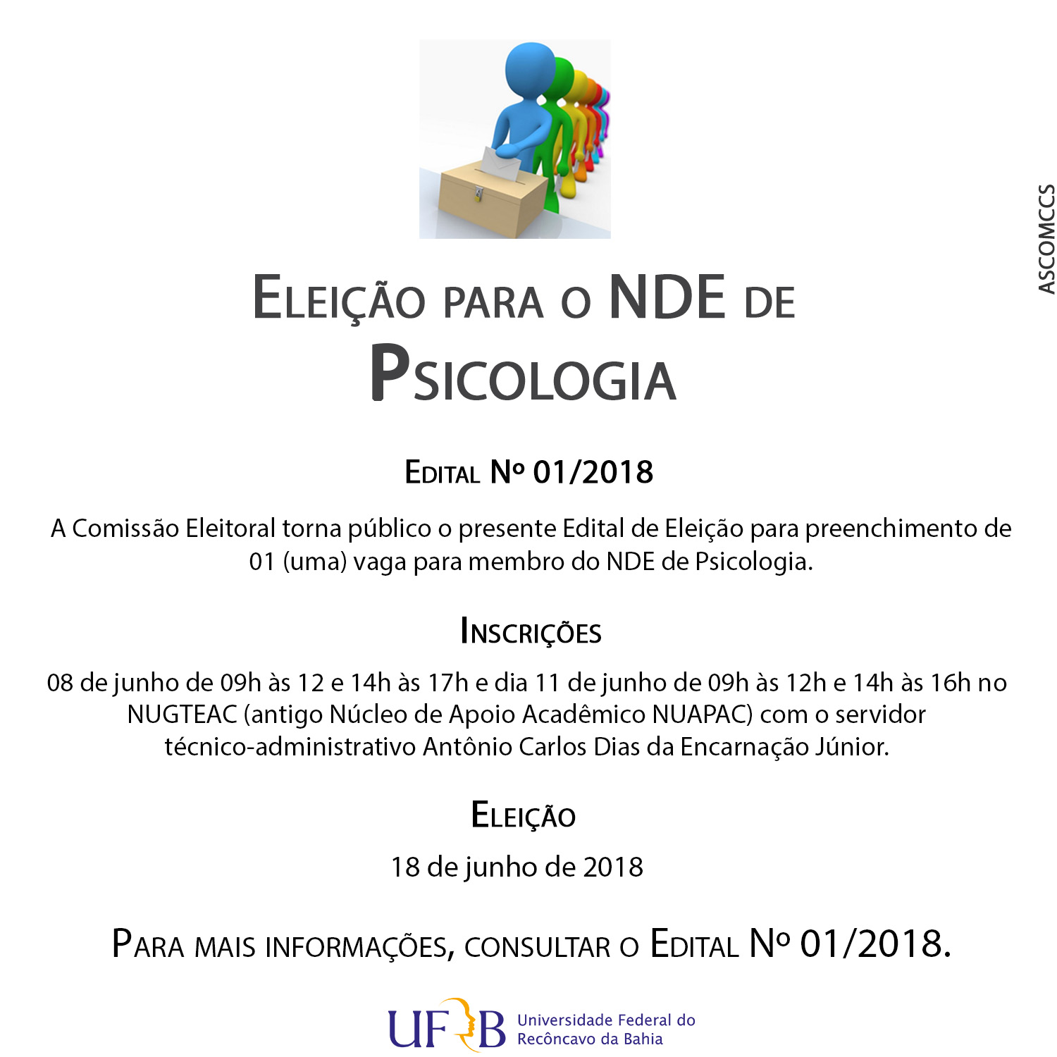 O Coordenador do Colegiado do Curso de Graduação em Psicologia da Universidade Federal do Recôncavo da Bahia (UFRB), Rafael Coelho Rodrigues, através da comissão para eleição designada pela Ordem de Serviço nº 02, de 21 de maio de 2018, torna público o presente Edital de Eleição para preenchimento de 01 (uma) vaga para membro do NDE.