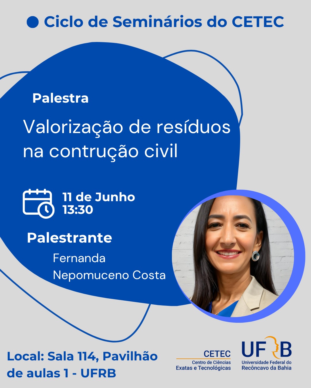 A palestra, que abordará o tema “Valorização de resíduos na construção civil”, integra as iniciativas da Gestão de Pesquisa do CETEC e tem como objetivo divulgar os trabalhos de pesquisa desenvolvidos pelos(as) docentes do centro, além de fortalecer a troca de conhecimentos e estimular a integração acadêmica.
