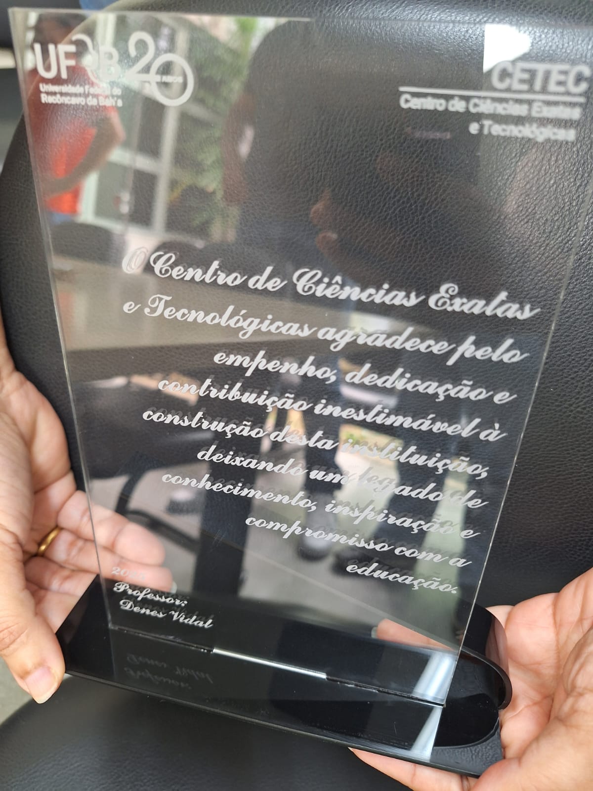 O Centro de Ciências Exatas e Tecnológicas (CETEC) presta uma justa homenagem ao professor Denes Vidal, que encerra sua carreira acadêmica conosco após uma trajetória marcada por dedicação, pioneirismo e compromisso com o ensino, a pesquisa e a extensão.