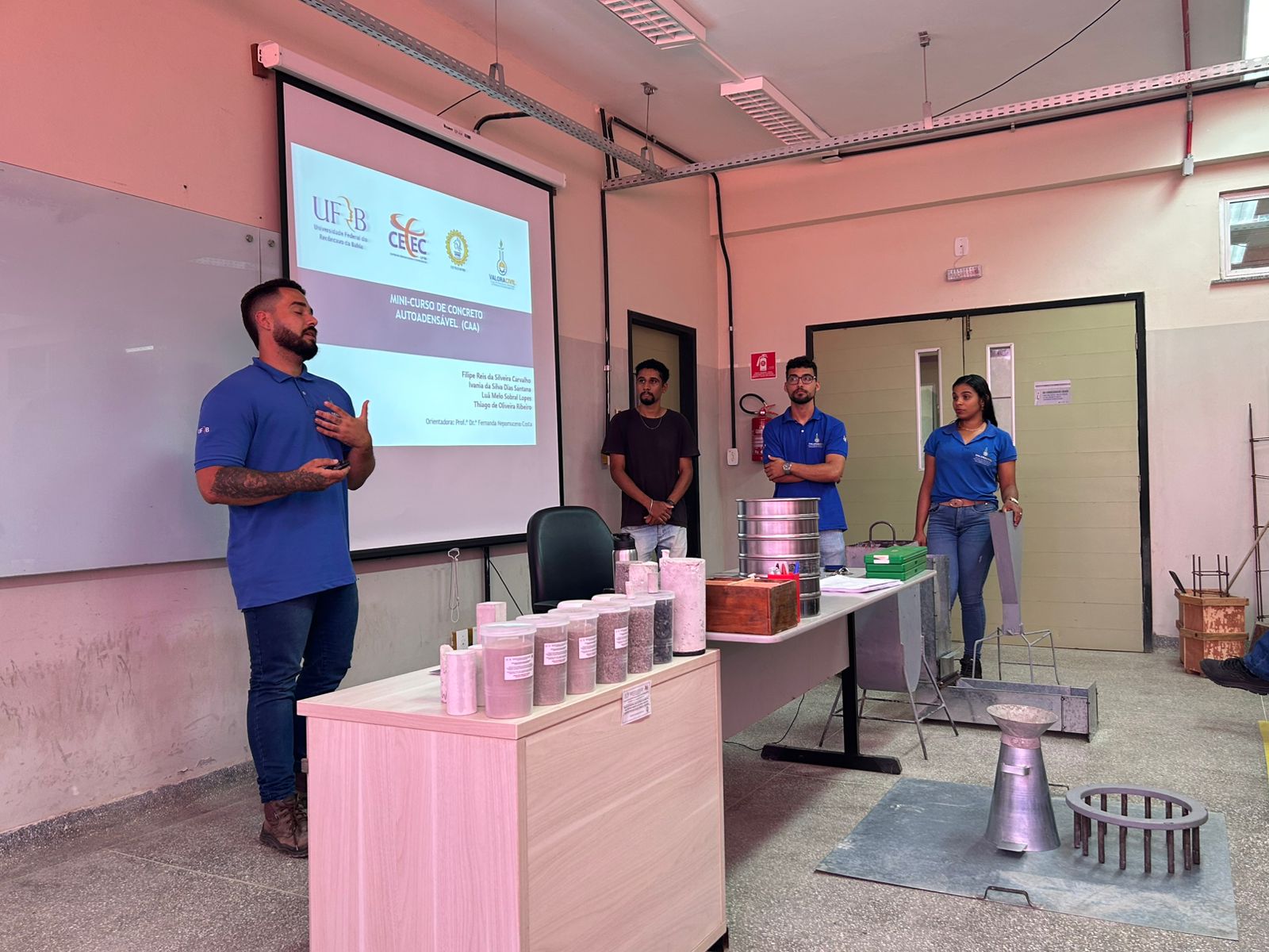 Durante os dois dias de evento, os(as) estudantes participaram de aulas práticas e minicursos voltados ao estudo do concreto, argamassas e reaproveitamento de resíduos na construção civil, além de conhecerem de perto os projetos de pesquisa e extensão desenvolvidos pelo grupo Valora Civil.