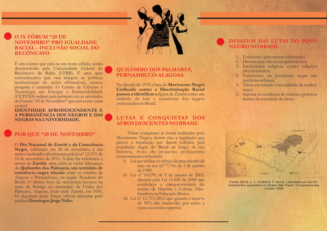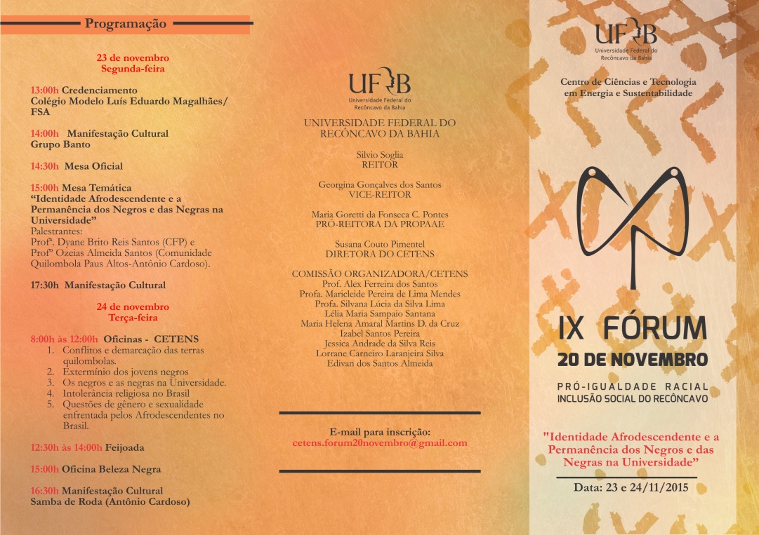 De acordo com a Portaria nº181/2006, as atividades acadêmicas e administrativas regulares, com exceção dos serviços essenciais, devem ser substituídas por atividades acadêmicas especiais de natureza diversificada, preferencialmente interdisciplinares, sobre temas relacionados à temática étnico-racial, à inclusão social e políticas afirmativas, envolvendo as comunidades acadêmicas dos campi e a comunidade regional. Mais informações e a programação completa do IX Fórum 20 de novembro - Pró Igualdade Racial e Inclusão Social do Recôncavo aqui.