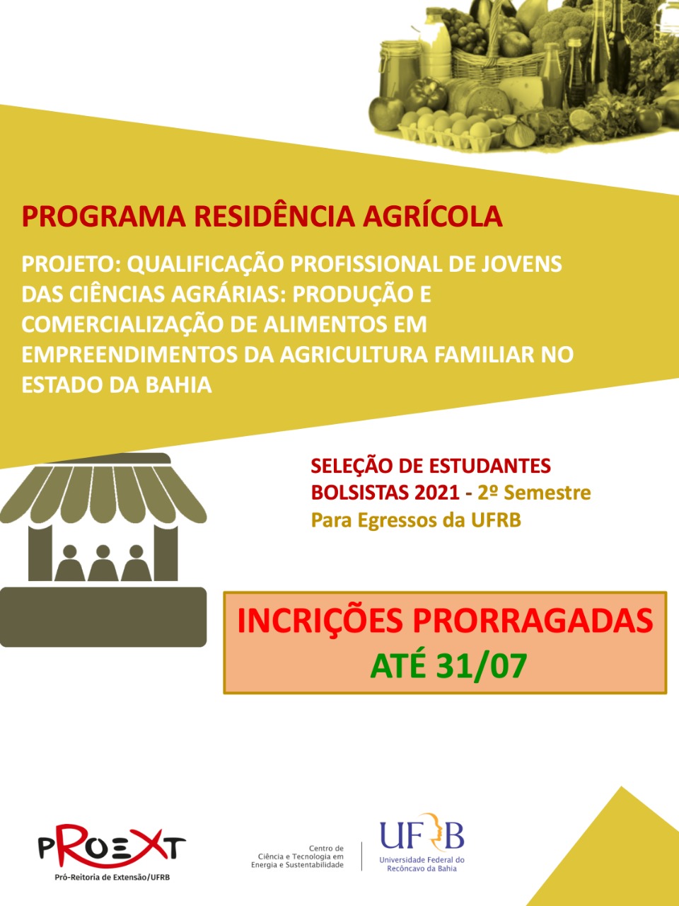 A Comissão de Seleção Residência Agrícola CETENS/UFRB prorroga o prazo de inscrições na Seleção de Estudantes Bolsistas para o dia 31/07. O Programa Residência Profissional Agrícola tem como objetivo principal promover a formação e a qualificação técnica de estudantes dos Cursos de Especialização da UFRB, recém egressos dos Cursos de Graduação de Ciências Agrárias e Afins para acesso ao mercado de trabalho, com atuação junto aos empreendimentos da agricultura familiar na produção de alimentos, com a contribuição em assessoria técnica e em inovações tecnológicas no estado da Bahia. O projeto “Qualificação profissional de jovens das ciências agrárias: produção e comercialização de alimentos em empreendimentos da agricultura familiar no estado da Bahia” tem como público-alvo estudantes de especialização da UFRB, preferencialmente egressos da UFRB dos cursos Licenciatura em Educação do Campo nas Áreas de Conhecimento Ciências da Natureza ou Matemática, Curso Superior de Tecnologia em Gestão de Cooperativas e Curso Superior de Tecnologia em Agroecologia.