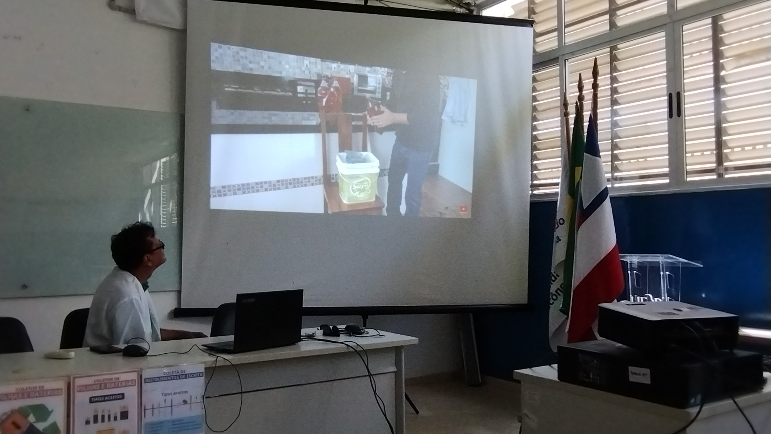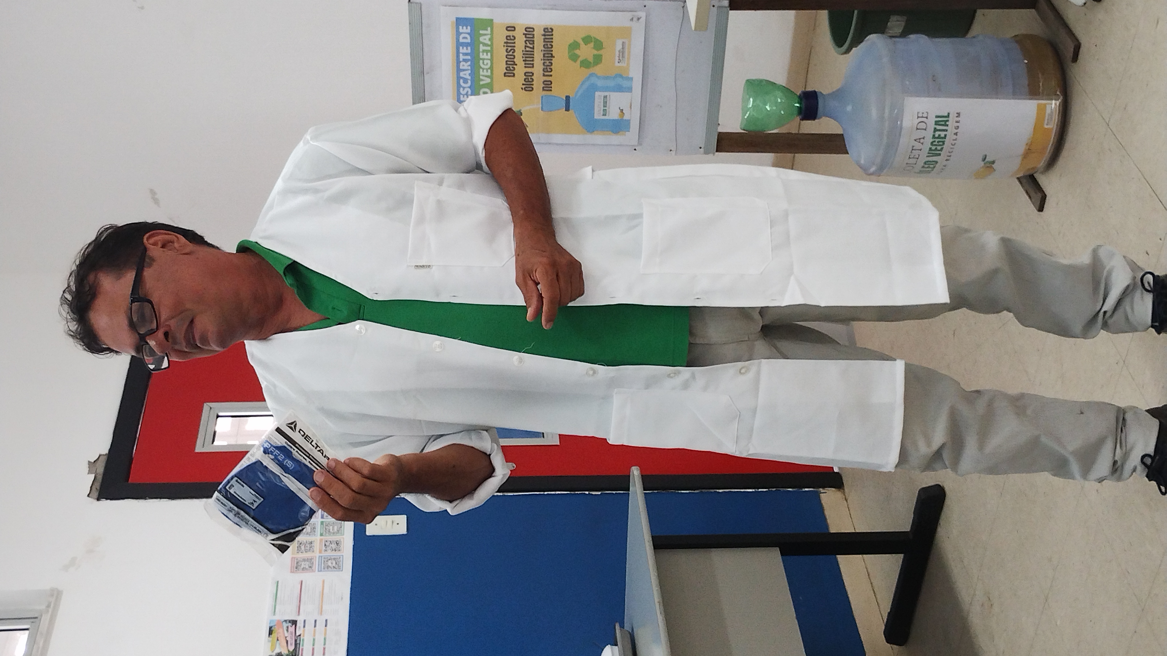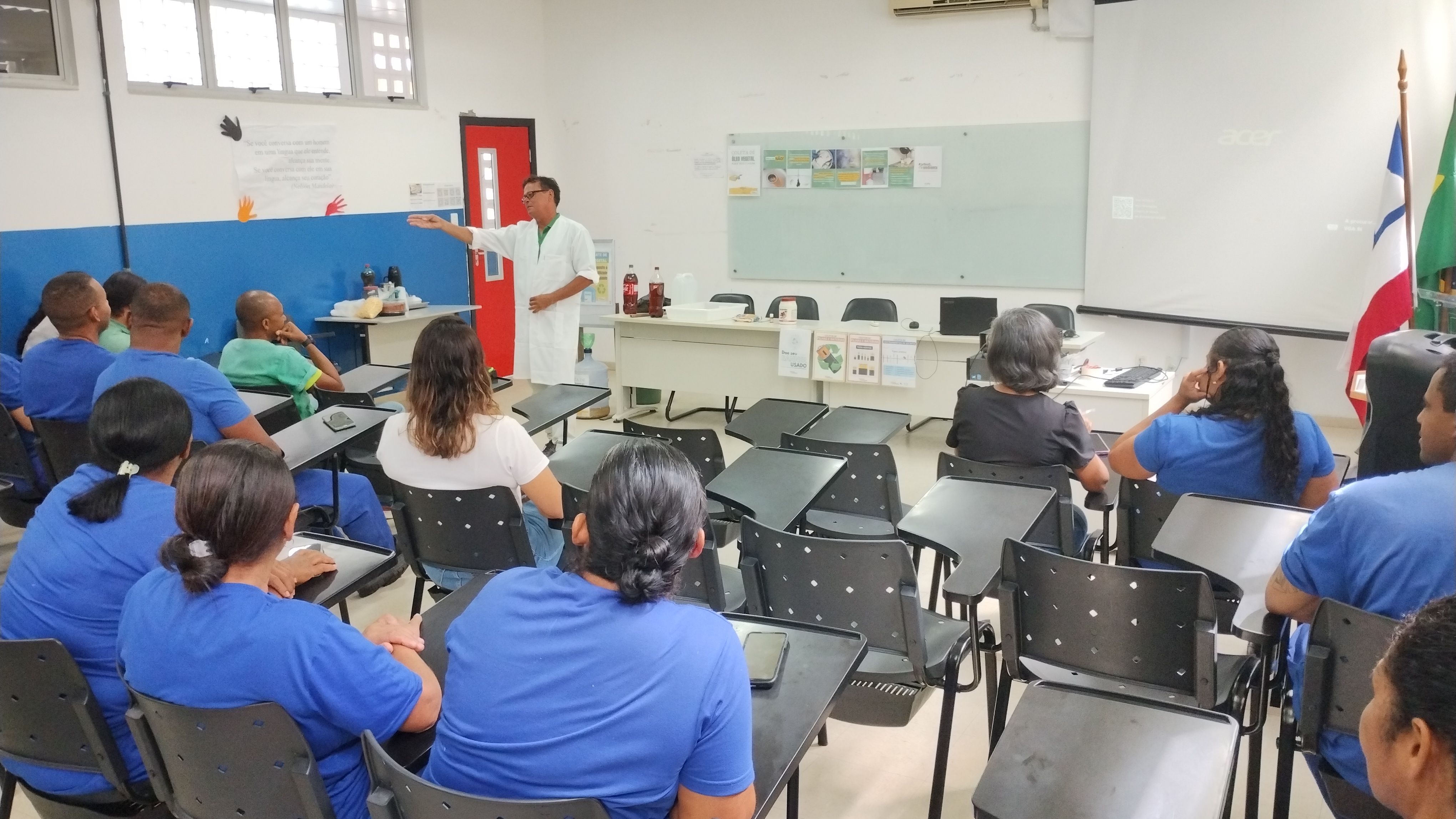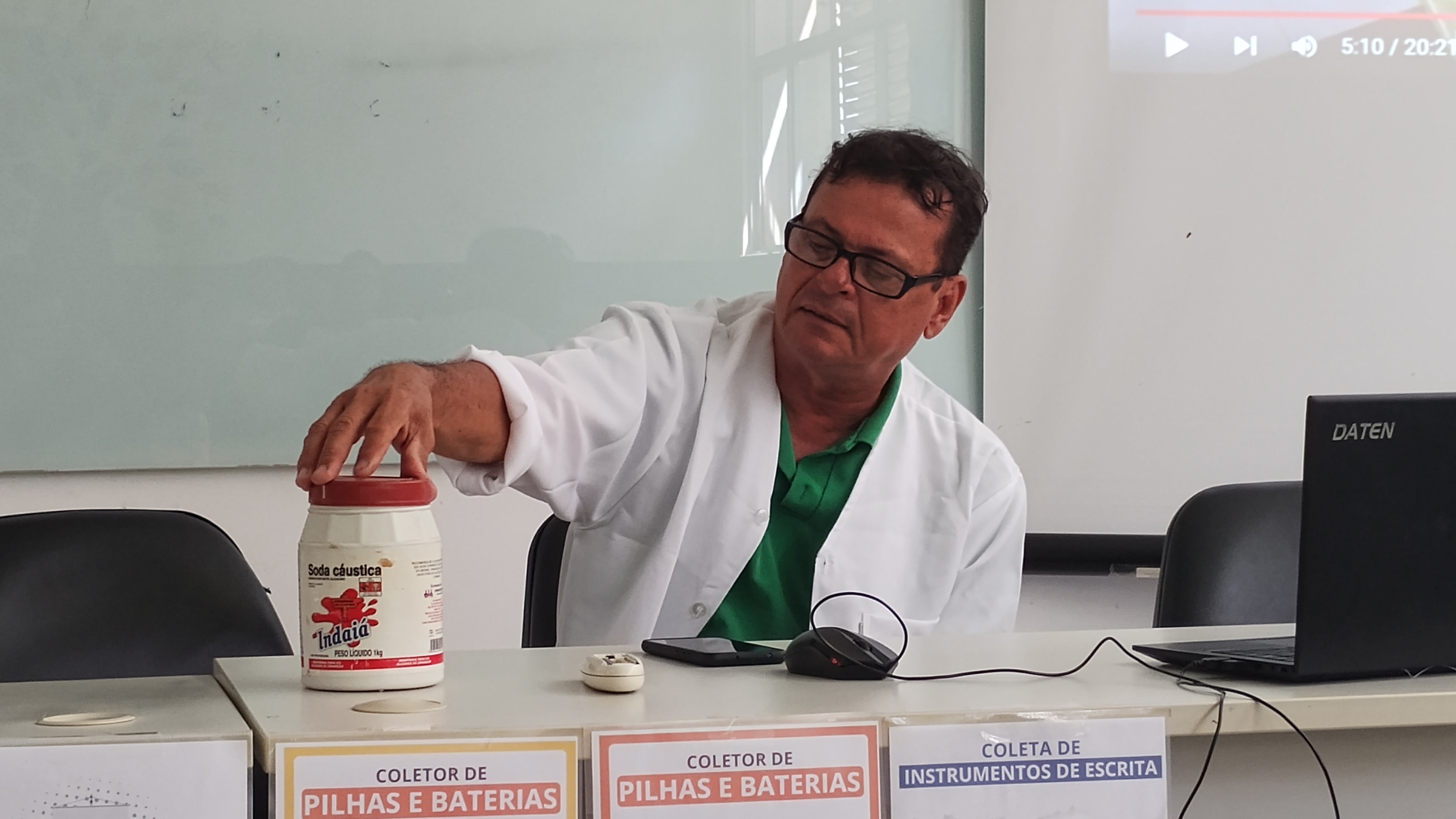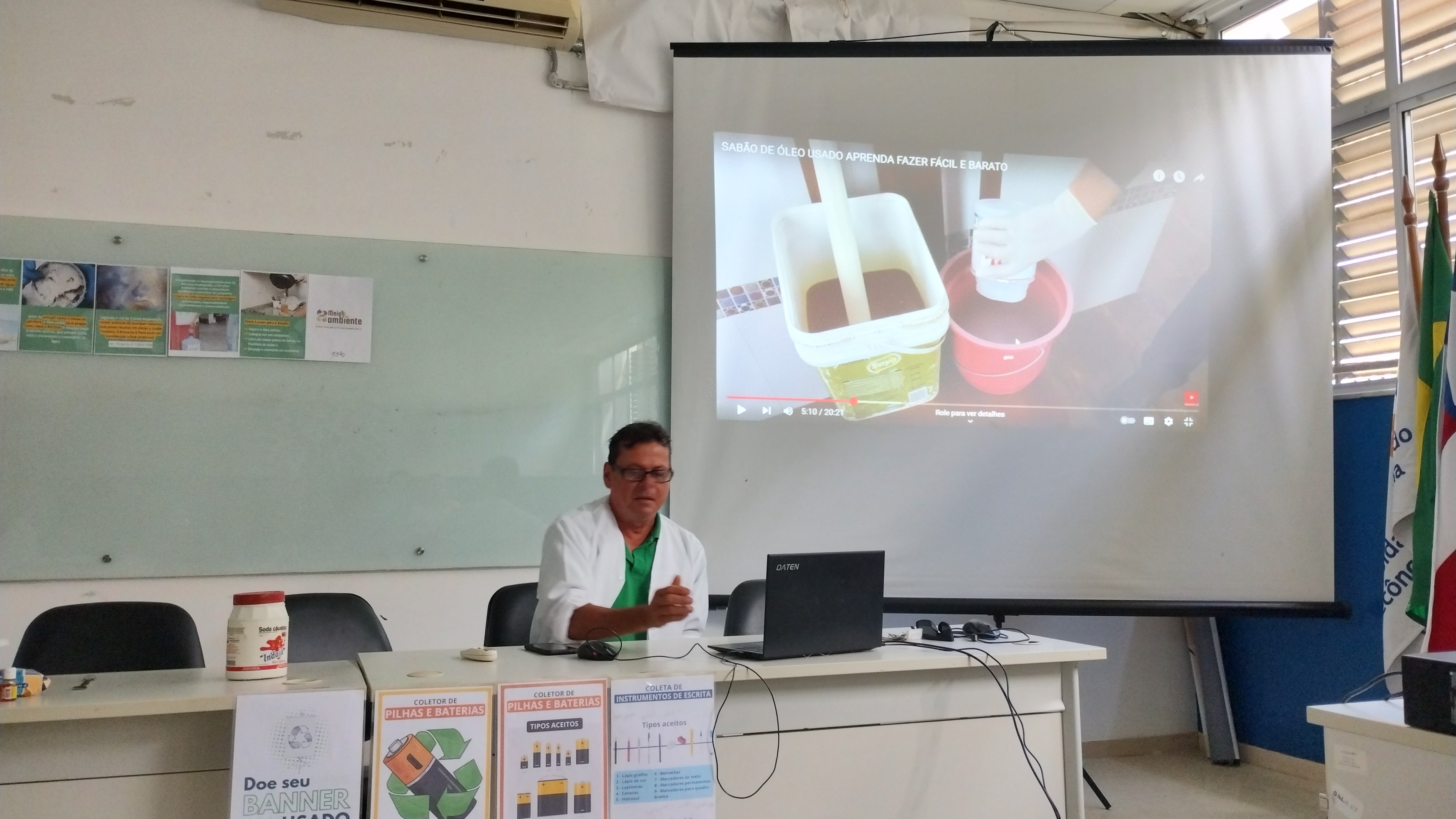 O instrutor apresentou os ingredientes básicos para a produção do sabão caseiro (água, óleo e soda cáustica), reforçando que existem diversas formas de prepará-lo, cabendo a cada pessoa escolher a mais adequada. Ele também alertou sobre os cuidados necessários no manuseio da soda cáustica (96-99%), como o uso obrigatório de máscara e luvas protetoras, e detalhou o processo de mistura.