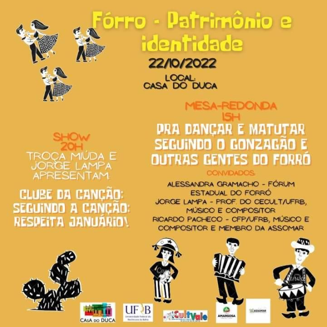 A tarde a prosa vai ser boa com Alessandra Gramacho (Fórum Estadual do Forrró), Ricardo Pacheco (professor do CPF/UFRB, músico e compositor) e Jorge Lampa (prof. do CECULT/UFRB, músico e compositor).