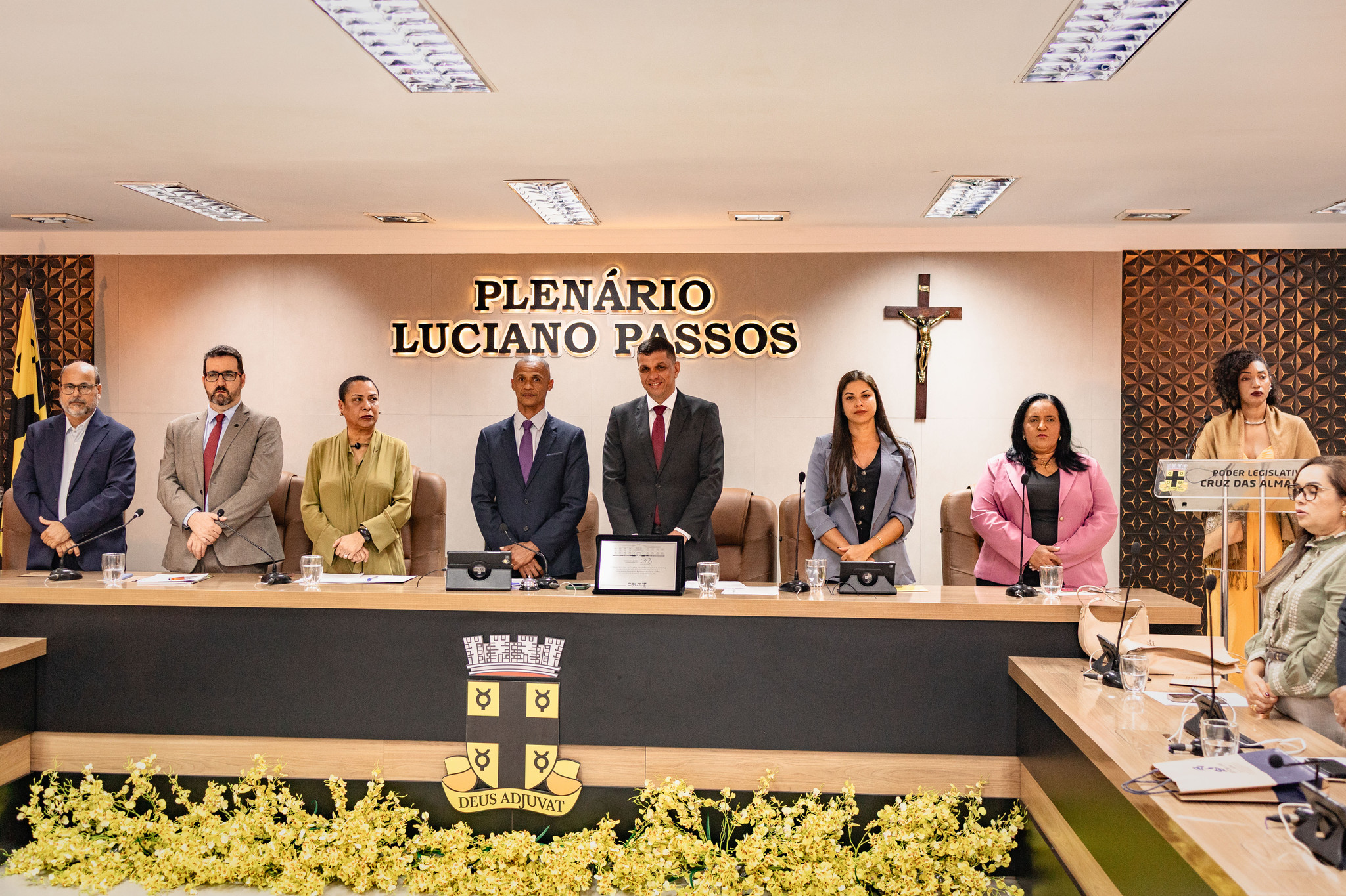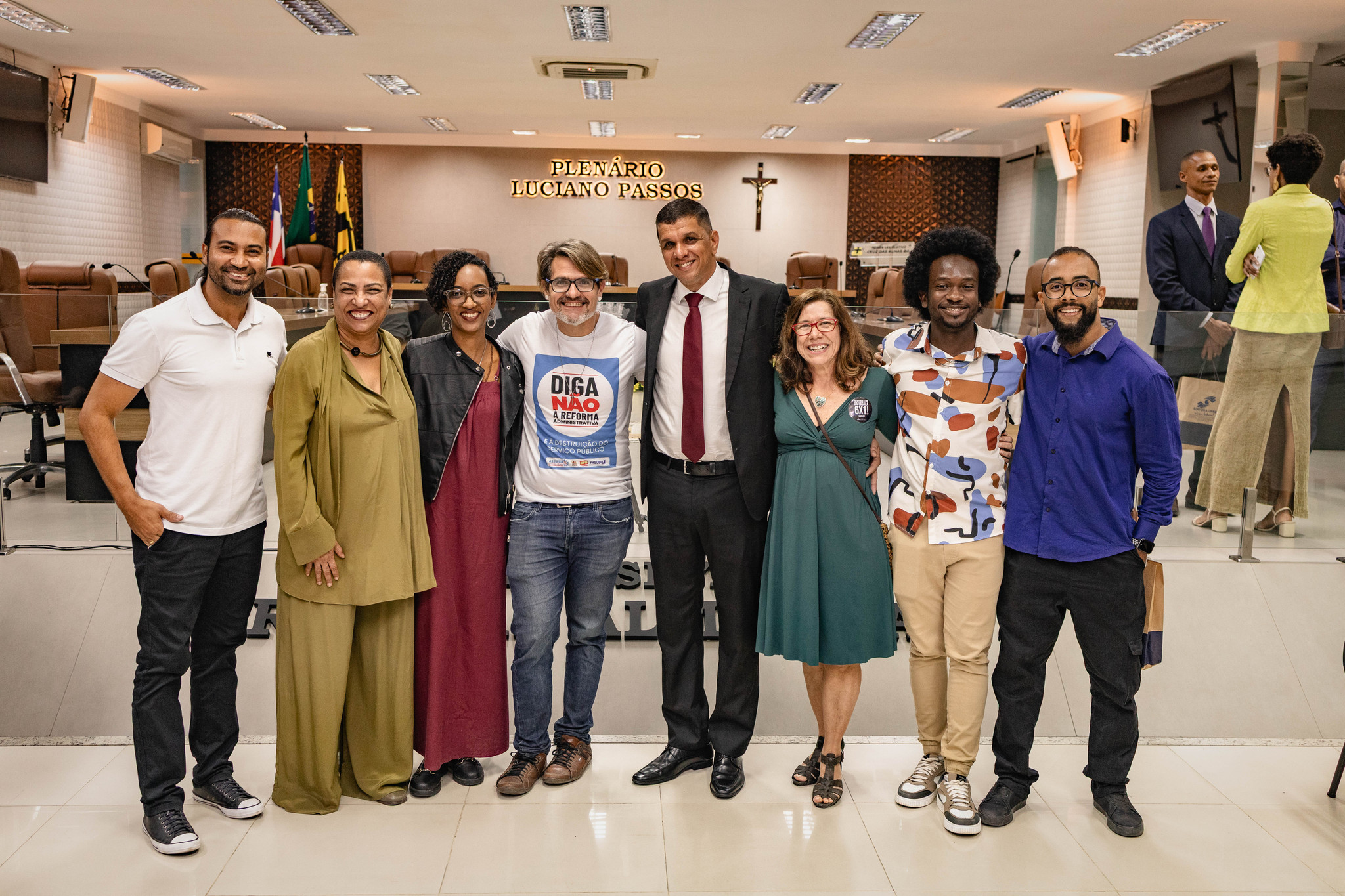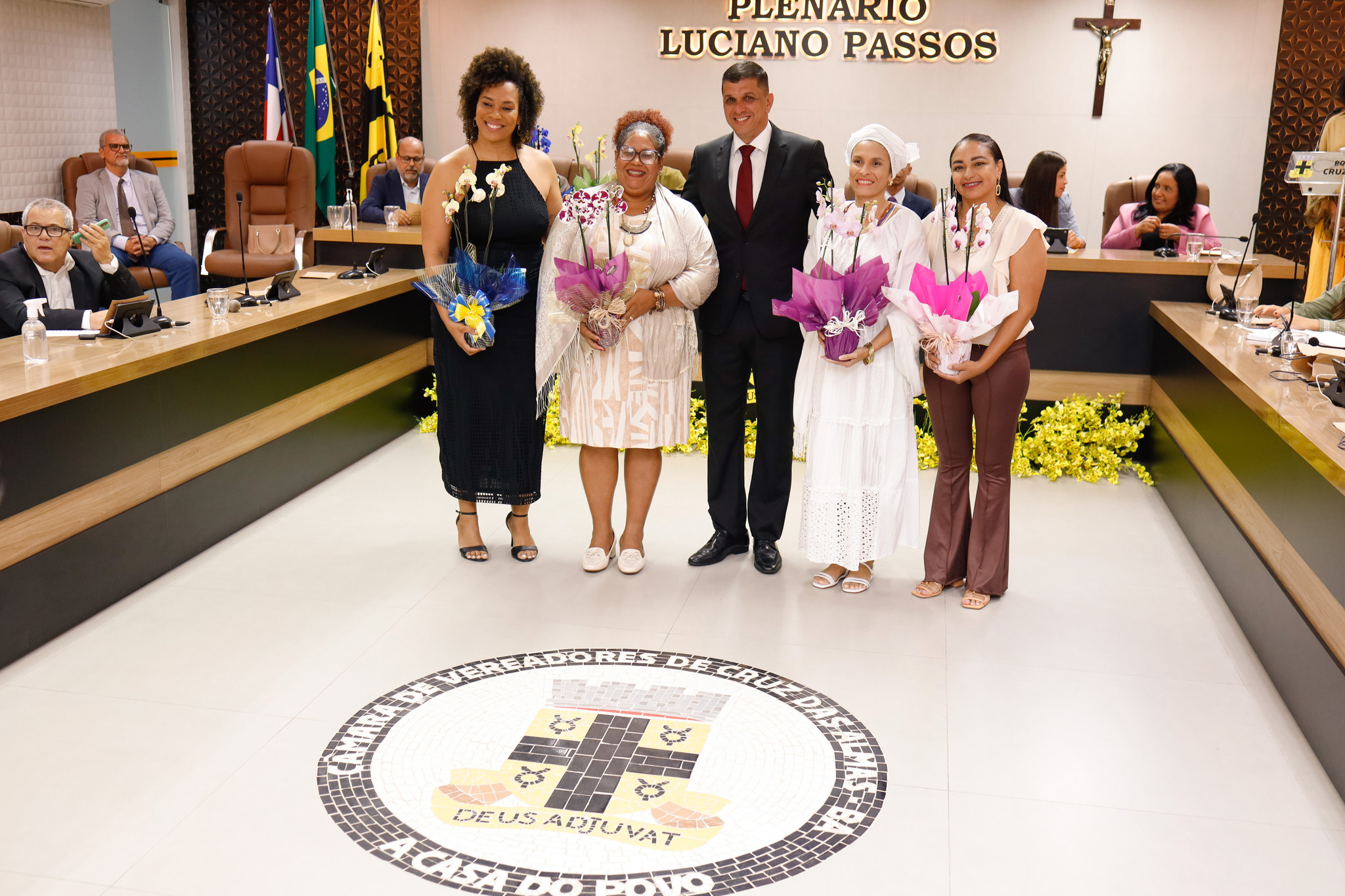 Estiveram presentes na sessão solene os(as) vereadores(as) Aline Brandão, André Eloy, Angélica, Bimba da Gente, Cepacol, Gerson Rubronegro, Marcelo Vieira, Nego da Farmácia e Roberto Ximba.