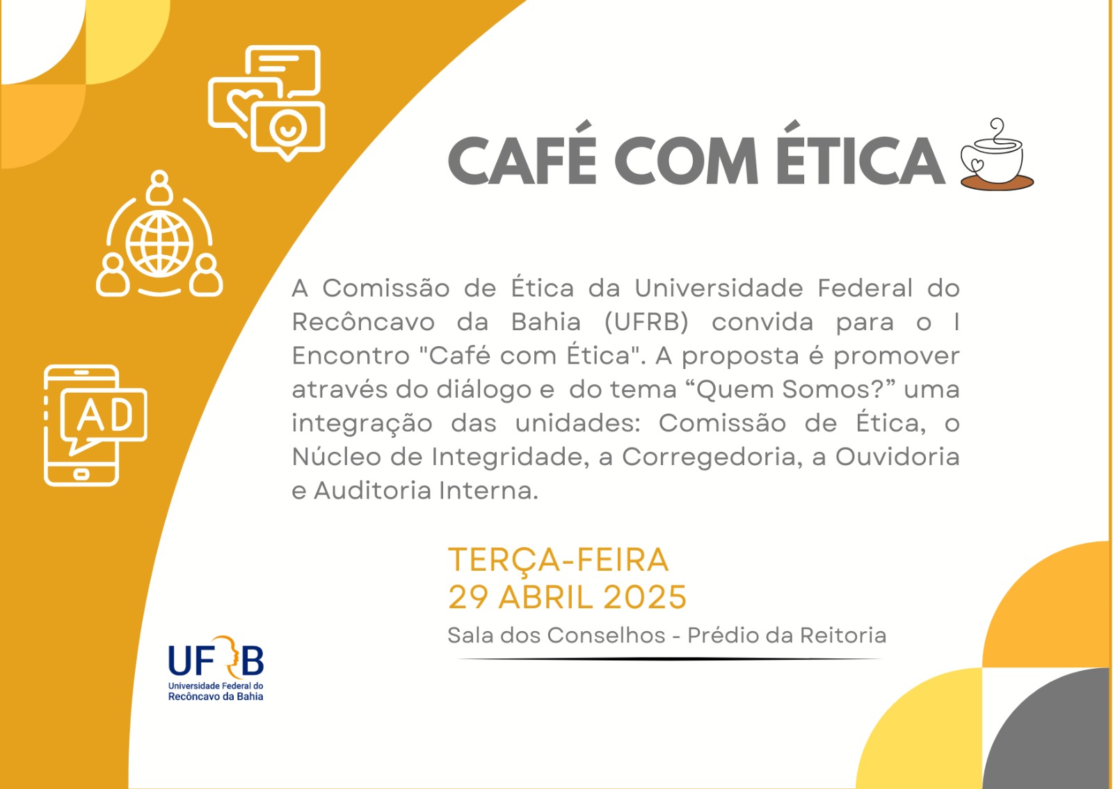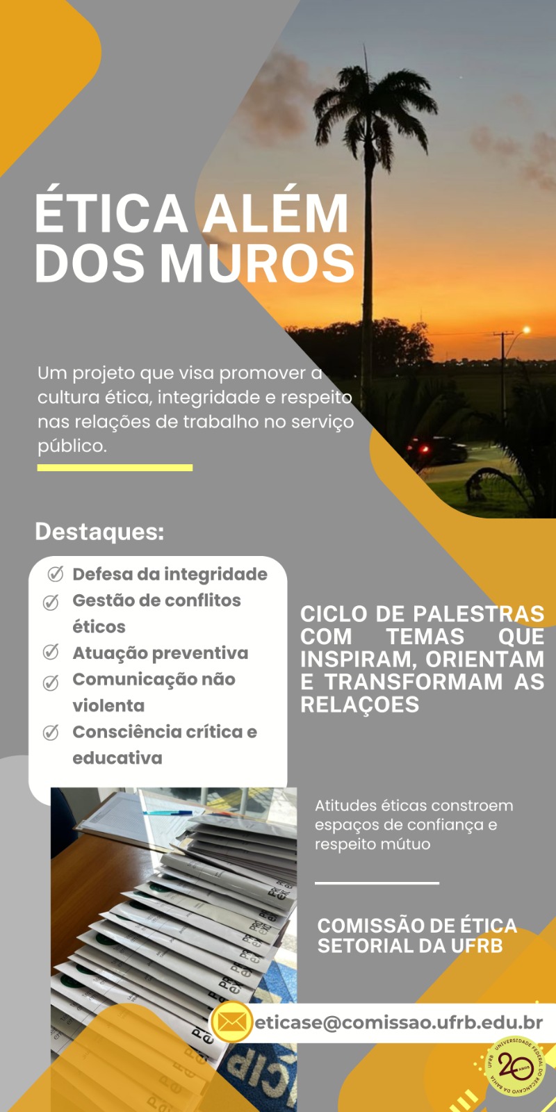 O projeto "ÉTICA ALÉM DOS MUROS" inicia seu ciclo de palestras A Comissão de Ética Pùblica Setorial da UFRB aprovou na Terceira Reunião Ordinária do dia...
