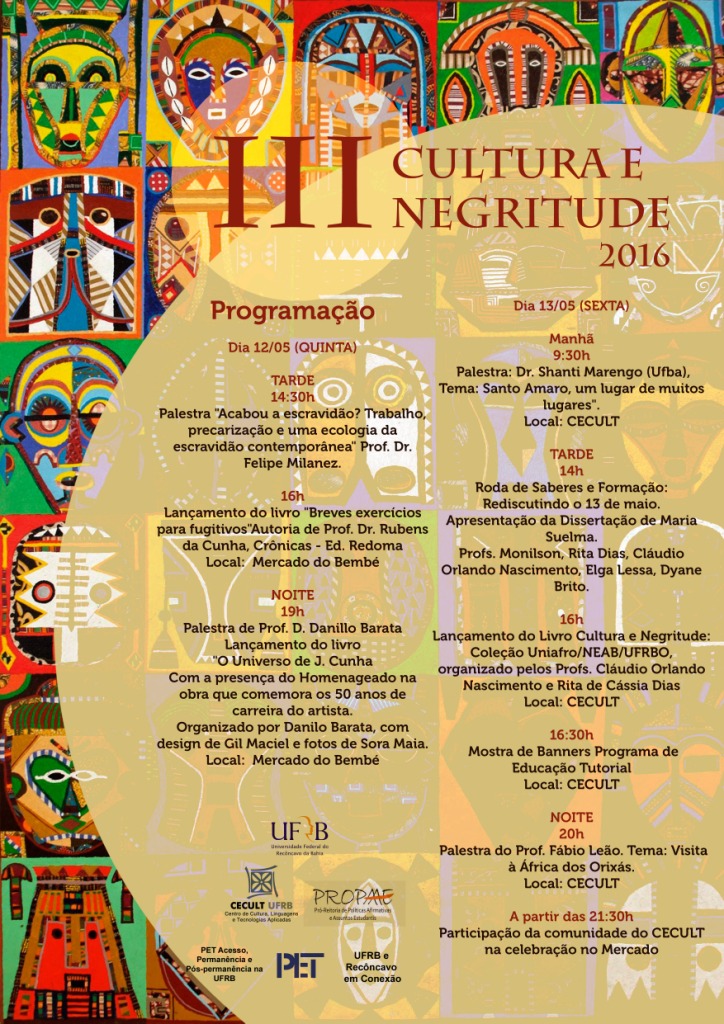 O Livro CULTURA E NEGRITUDE: Linguagens do contemporâneo (Orgs. Cláudio Orlando C. Nascimento e Rita Dias), da Coleção UNIAFRO (Org. Antônio Liberac Pires)/NEAB Recôncavo / Mestrado Profissional em História da África, da Diáspora e dos Povos Indígenas, será no Bembé, no III Cultura e Negritude, CECULT-Sto. Amaro, conforme programação do Evento.