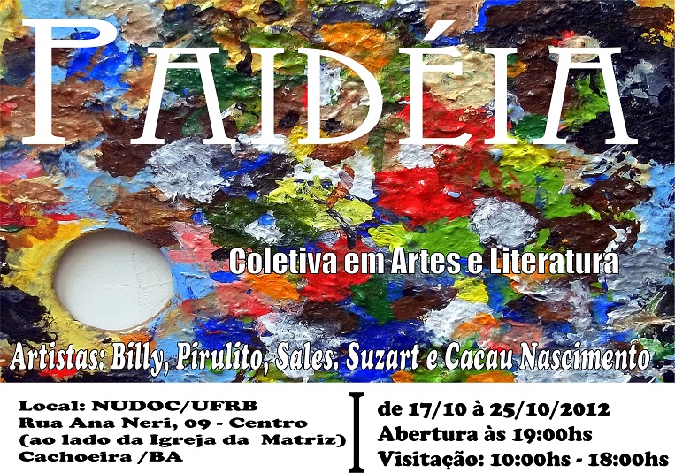 O Núcleo de Memória e Documentação (NUDOC) da Universidade Federal do Recôncavo da Bahia (UFRB) promove até o próximo dia 25 a PAIDEIA: Coletiva em Artes e Literatura. A visitação é entre 10h00 e 18h00, no NUDOC, Rua Ana Néri, 09 - Cachoeira.