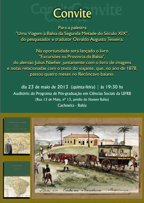 Durante este evento será lançado o livro “Excursões na Província da Bahia", do alemão Julius Naeher, juntamente com o livro de imagens e notas relacionadas com o texto do viajante, que, no ano de 1878, passou quatro meses no Recôncavo Baiano. A organização do evento é do Núcleo de Memória e Documentação (NUDOC) da Universidade Federal do Recôncavo da Bahia com as orirntações do Prof. Dr. Walter Fraga.