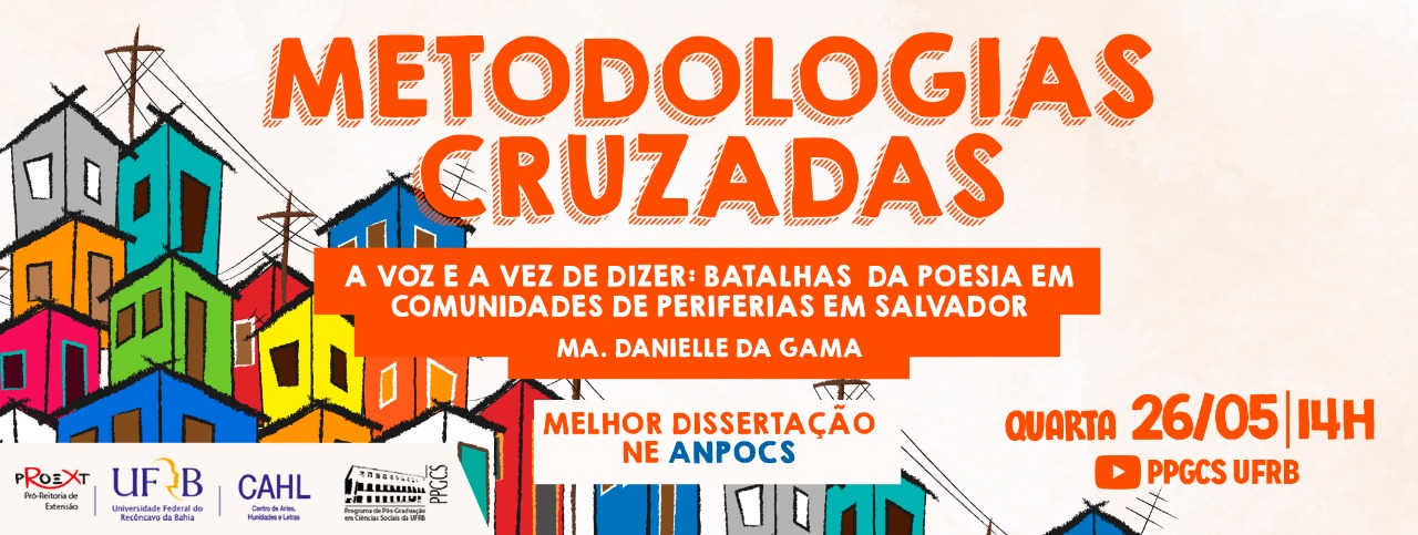 Estamos aqui com muita satisfação convidando a todes para o Metodologias Cruzadas com a egressa da UFRB premiada pela ANPOCS como a melhor dissertação da região Norte/Nordeste, no dia 26 de Maio, quarta-feira feira, 14h, o acesso será pelo youtube TV UFRB (link do evento).