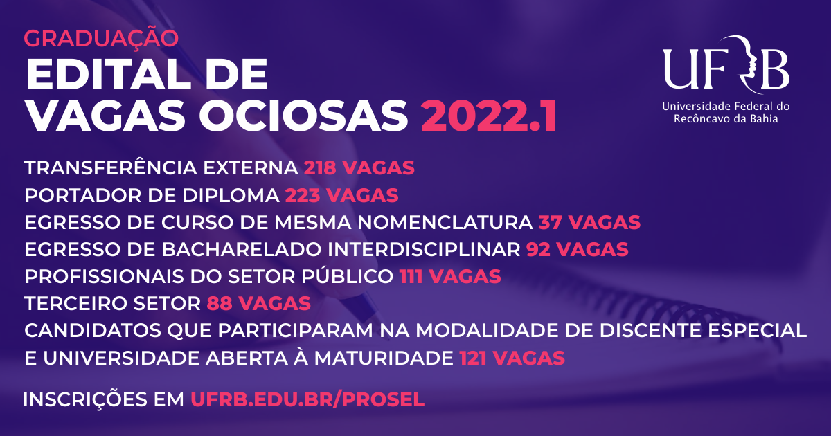 A Universidade Federal do Recôncavo da Bahia (UFRB) oferece 1.085 vagas em 42 cursos de graduação da instituição para o semestre 2022.1. As vagas são destinadas aos candidatos nas formas de ingresso: Transferência ...