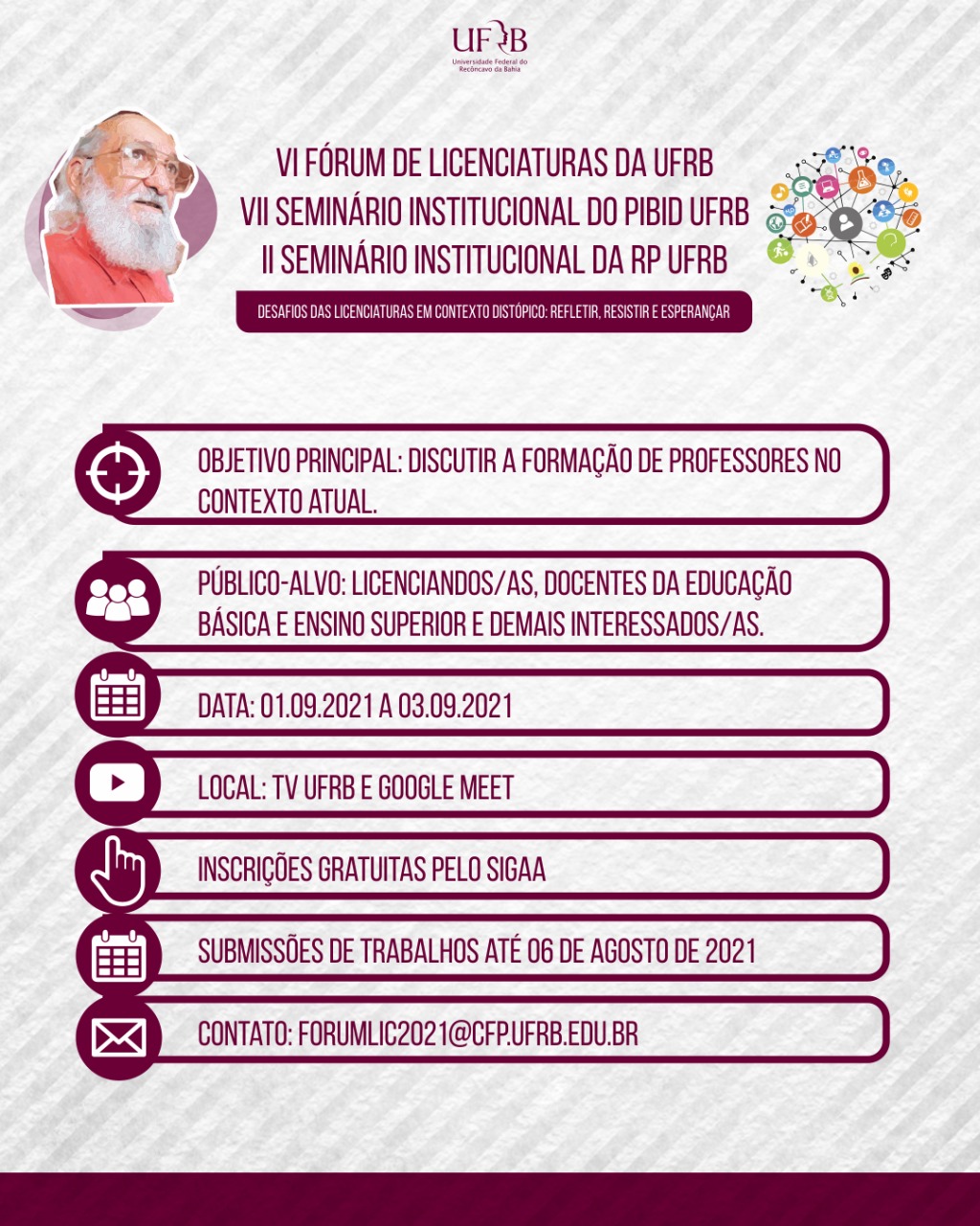 O VI Fórum de Licenciaturas da UFRB, previsto para ocorrer entre os dias 01 e 03 de setembro de 2021, junto com o VII Seminário Institucional do PIBID UFRB e II Seminário Institucional da RP UFRB, objetiva reunir professores, pesquisadores e licenciandos para refletir sobre o tema “Desafios das licenciaturas em contexto distópico: refletir, resistir e esperançar”.