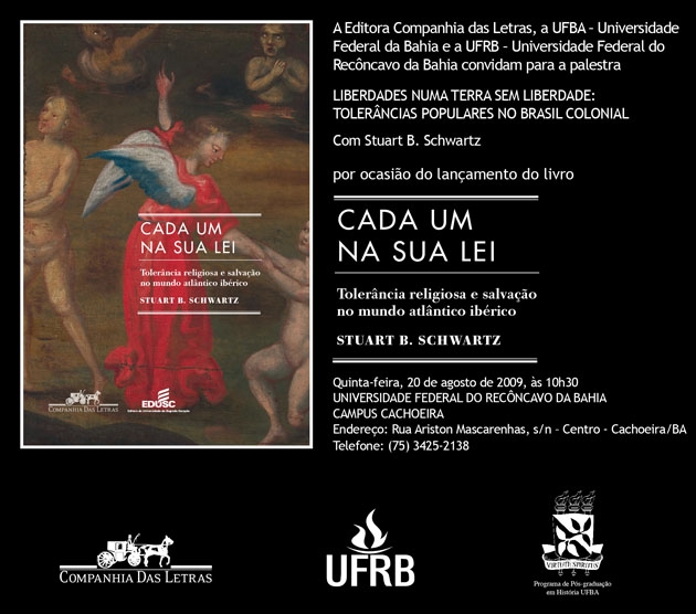 A Superintendência de Projetos de Cultura (UFRB) em parceria com a Editora Companhia das Letras, Programa de Pós-graduação em História da UFBa e o Grupo de Pesquisa Práticas Culturais, Religiosidade e Imaginário (UFRB/CAHL) convidam para a palestra do historiador Stuart Schwartz intitulada "Liberdades numa Terra sem Liberdade: Tolerâncias Populares no Brasil Colonial" e lançamento do seu último livro Cada um na sua Lei: Tolerância Religiosa e Salvação no Mundo Atlântico Ibérico (Companhia das Letras, 2009). Palestra e lançamento ocorrerão no auditório do CAHL, quinta-feira, 20 de agosto, às 10:30.