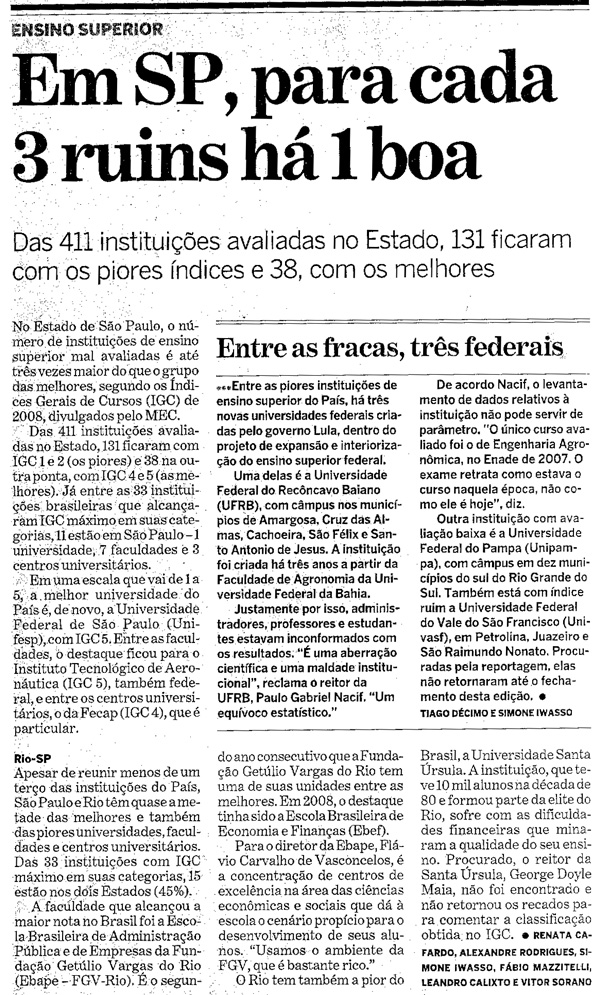 Reportagem do Estadão destaca que as IFES com notas baixas no ENADE foram criadas no Plano de Expansão
