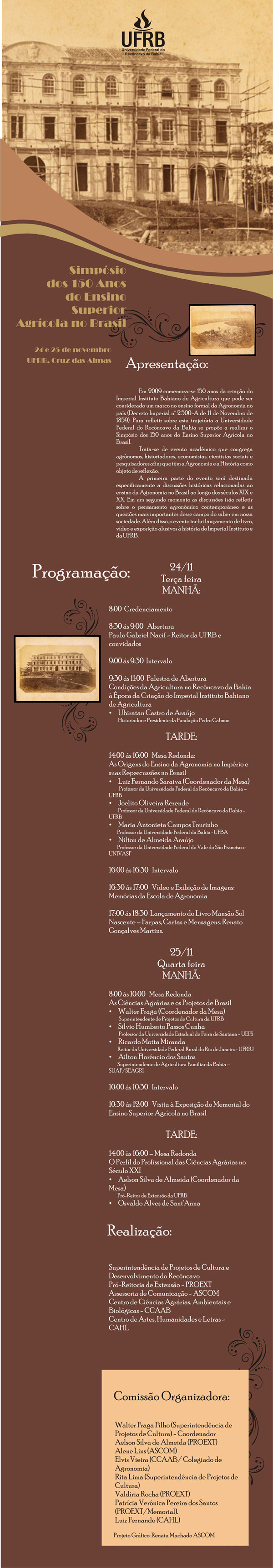 O Simpósio trouxe as discussões históricas relacionadas ao ensino da Agronomia no Brasil ao longo dos séculos XIX e XX, até reflexões sobre o pensamento agronômico contemporâneo e as questões mais importantes desse campo do saber em nossa sociedade atual. O evento incluiu lançamento de livro, vídeo e exposição alusivos à história do Imperial Instituto e da UFRB. Conheça o